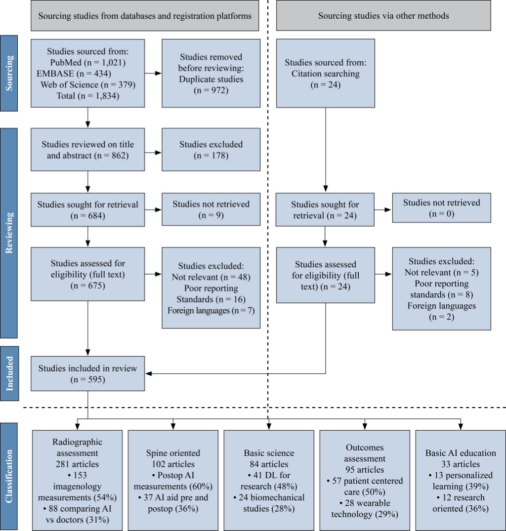Material y métodos: se realizaron búsquedas en PubMed, EMBASE y Google Scholar desde enero de 2020 hasta el 31 de octubre de 2023. Se identificaron 862 estudios, de los cuales 595 fueron incluidos. Se incluyeron un total de 281 estudios sobre evaluación radiográfica, 102 sobre cirugía de columna, 95 sobre evaluación de resultados, 84 sobre educación ortopédica y 33 aplicaciones de ciencias básicas. Los resultados primarios fueron la precisión diagnóstica, diseño del estudio y estándares de presentación de informes en la literatura. Las estimaciones se agruparon mediante un metaanálisis de efectos aleatorios.