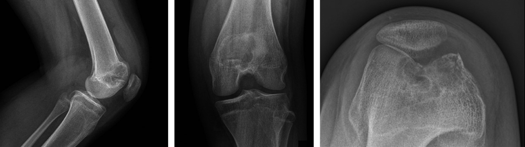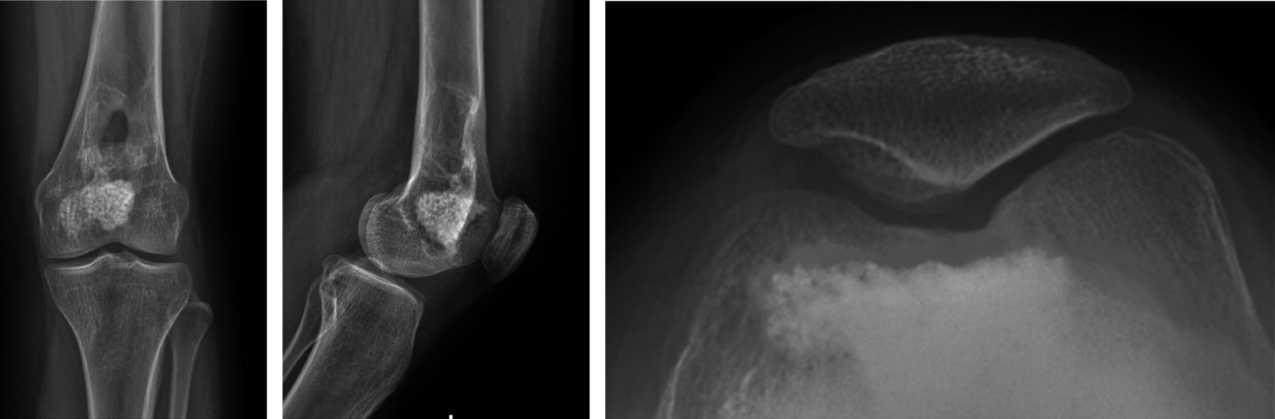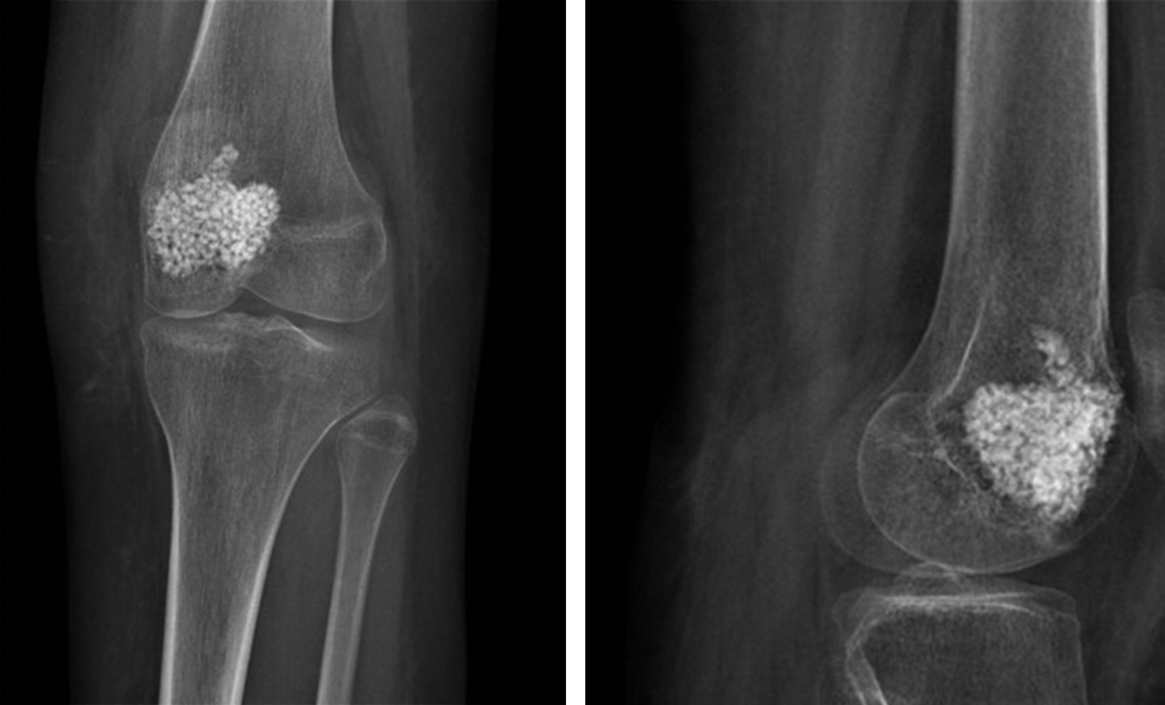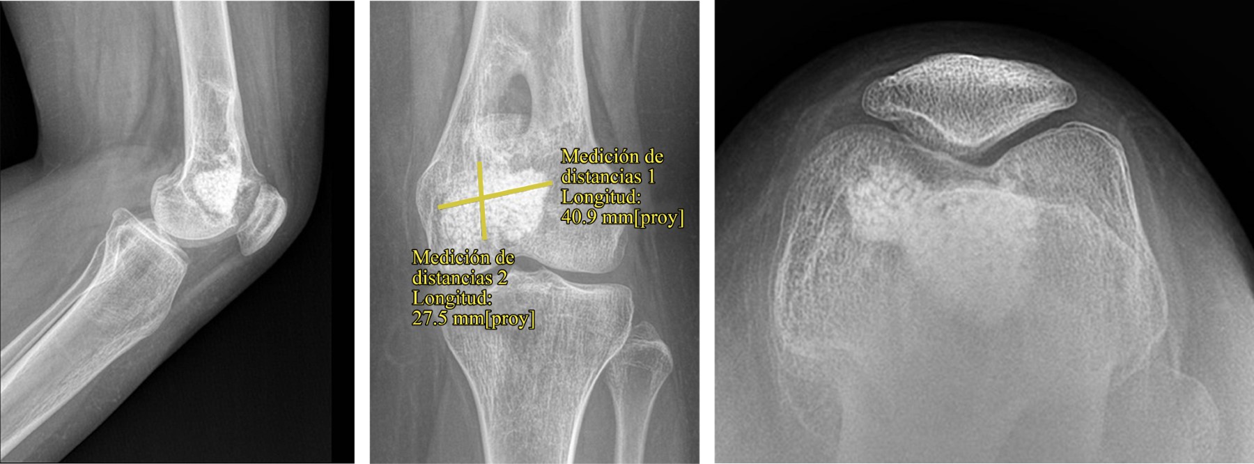 Se trata de paciente de sexo femenino de 15 años y cinco meses, sin antecedentes médicos de importancia. Consultó por primera vez en Julio de 2018 por caída a nivel en escalera, con golpe en rodilla izquierda. Evolucionó con dolor e impotencia funcional inmediata. Al interrogatorio dirigido refirió dolor de tipo insidioso desde hace seis meses, sin antecedente de trauma. Se solicitaron radiografías de fémur derecho anteroposterior y lateral en el servicio de urgencias, las cuales mostraron una fractura en fémur distal izquierdo, con sospecha de fractura en hueso patológico en la metáfisis distal de fémur con imagen que impresiona tener una lesión lítica bien delimitada, con calcificaciones centrales, rodeada por un borde esclerótico delgado sin reacción cortical, con un patrón de pop-corn similar al de un condroblastoma (Figura 1).