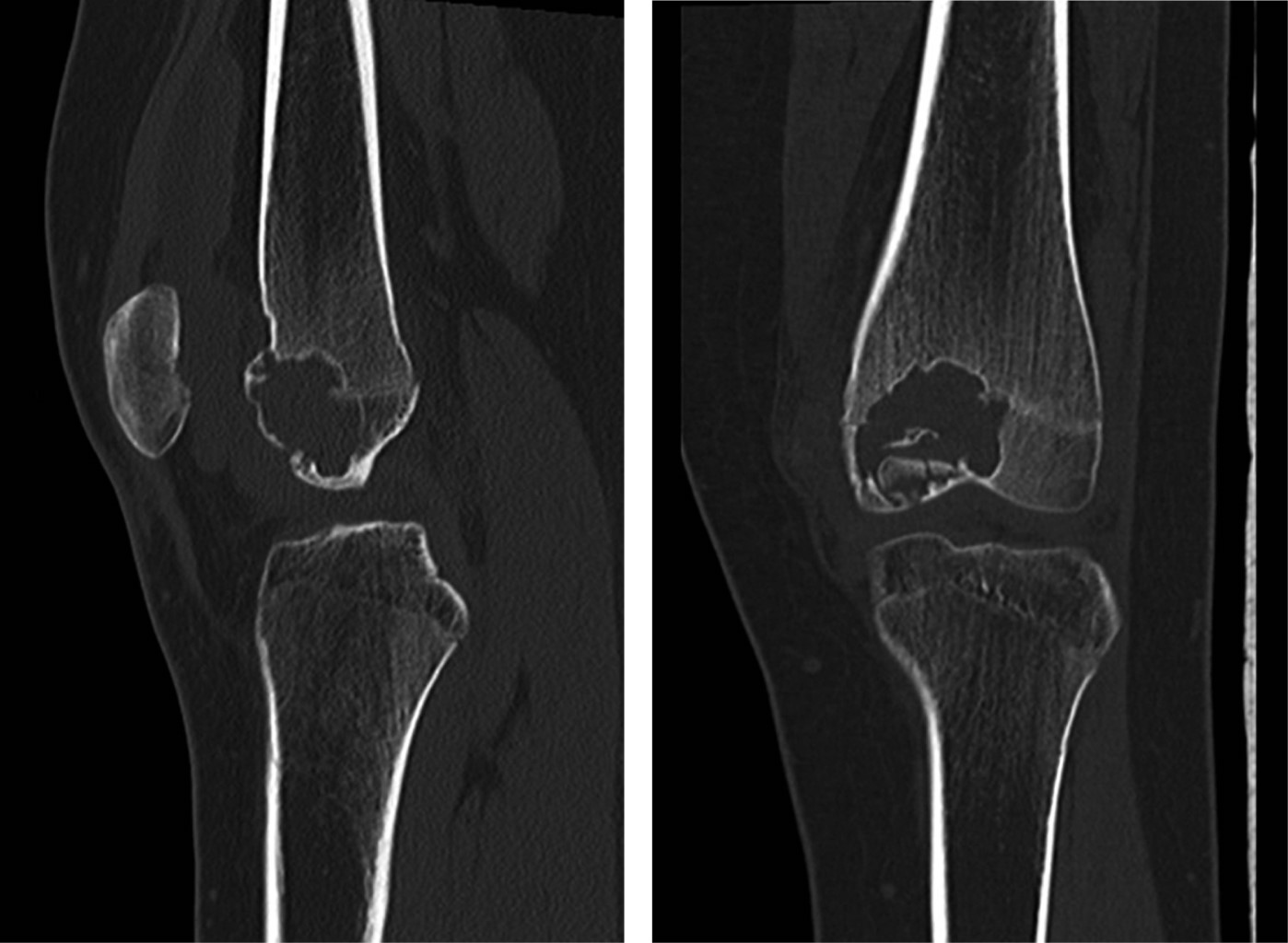 La paciente se mantuvo, posterior a la segunda intervención, sin nuevos síntomas, con controles radiológicos periódicos, sin nuevos hallazgos. Consultó a los tres años postoperada por dolor anterior de rodilla, sin antecedente de trauma, describiéndose una rodilla estable, sin aumento de volumen ni de temperatura local, con dolor ubicado en relación a la articulación patelofemoral. Se tomaron imágenes radiográficas y TAC de rodilla izquierda en las que se muestra la presencia de una lesión quística postoperatoria en región metafisaria, no sugerente de recidiva (Figuras 6 y 7). Este cuadro se manejó de manera efectiva con fisioterapia enfocada en fortalecimiento muscular y propiocepción.