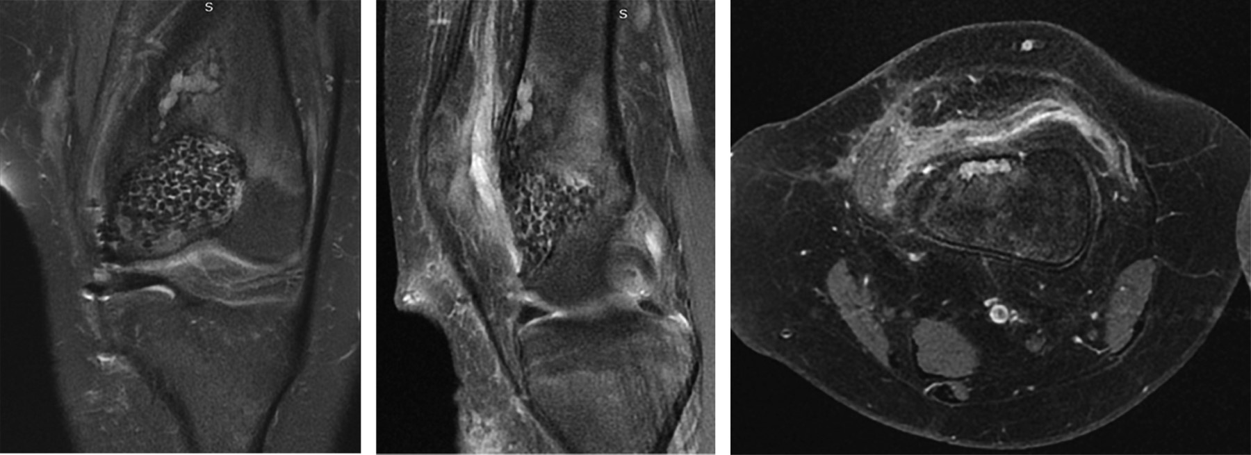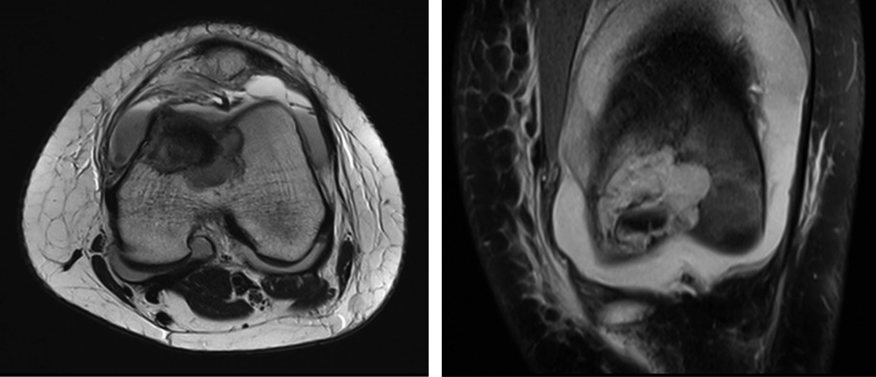 Se realizó el estudio complementario con TAC y RMN; en el cual la TAC de rodilla indicó una imagen lítica metafisaria de fémur distal de bordes circunscritos bien definidos con fractura en hueso patológico, sin colapso de la columna medial (Figura 2) y en la RMN en el corte T2 y supresión grasa, se observó una lesión de márgenes escleróticos sin signos de reacción perióstica, con relleno de aparente densidad líquida levemente heterogéneo, con aparente invasión fisaria, sin compromiso de partes blandas, siendo compatible con neoplasia de origen condral coincidiendo con la sospecha diagnóstica de condroblastoma de fémur distal (Figura 3).