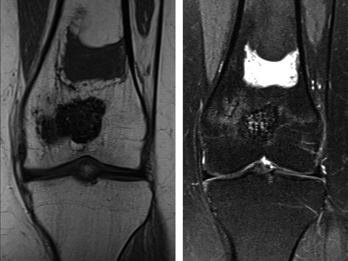 De acuerdo con el estudio realizado por Wang y colaboradores,2 el síntoma principal desarrollado por los pacientes fue el dolor local, para el cual reportó un 94.6% de incidencia. Otros síntomas incluyen limitación de la movilidad, derrame articular o atrofia muscular. Por otro lado, Yang y colegas3 reportan 20% de incidencia de síntomas como aumento de volumen de partes blandas, masa palpable o derrame. En nuestra paciente solamente se reportó un dolor insidioso de meses de evolución, que sufrió un aumento brusco debido a una caída a nivel. En este caso, el síntoma principal, que fue el dolor insidioso, sufre un cambio y pasa a ser un dolor de tipo súbito, debido a la fractura en hueso patológico del fémur distal. Esta fractura se manejó de manera ortopédica.
