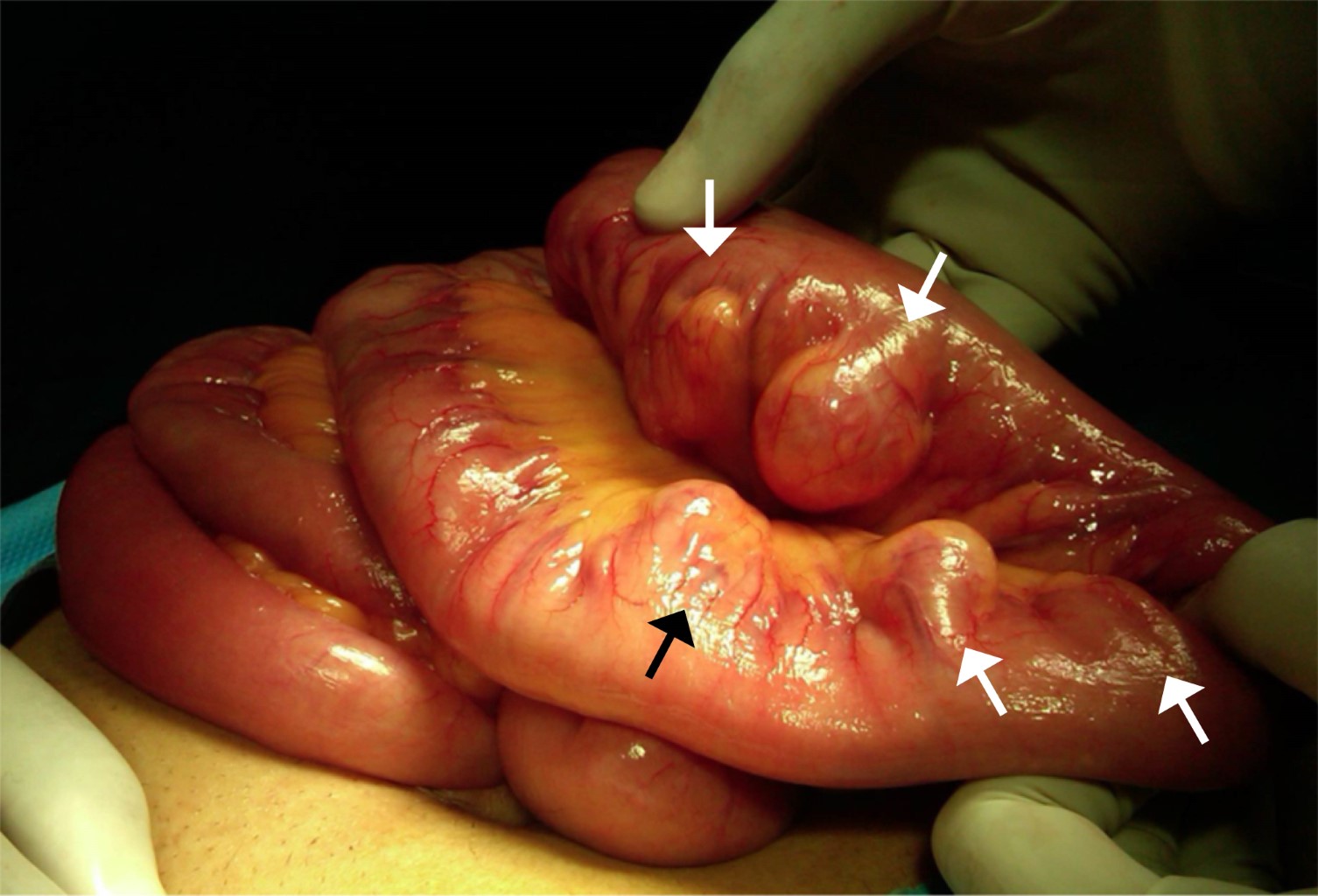 A pesar de un apropiado manejo farmacológico conservador, el paciente presentó un nuevo episodio de resangrado caracterizado por inestabilidad hemodinámica y descenso significativo de la hemoglobina, motivando laparotomía exploradora de urgencia, que reportó múltiples divertículos yeyunales (Figura 3).