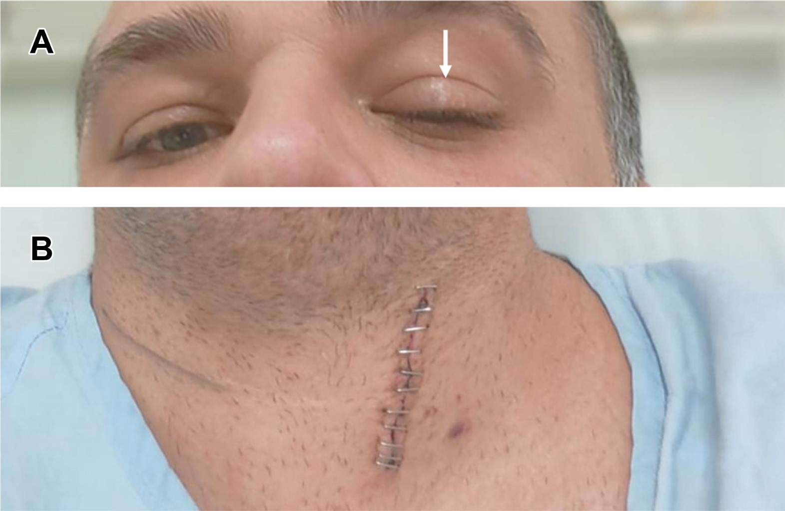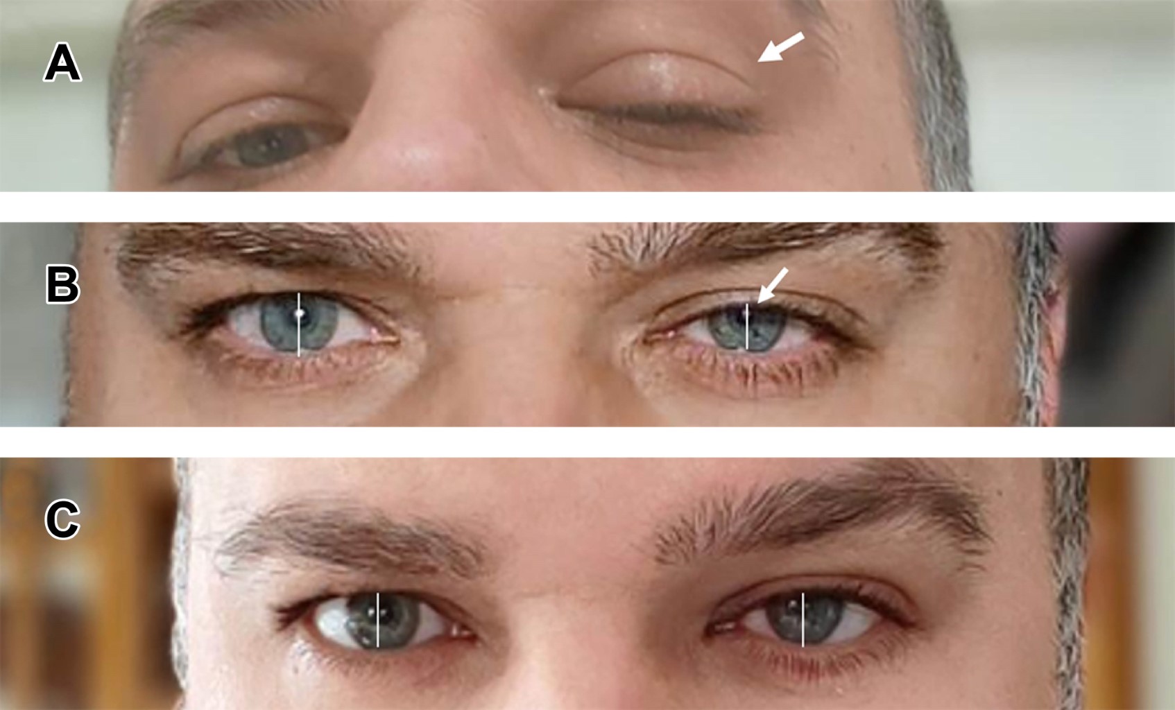 Hombre de 40 años, con antecedente traumático de columna cervical, llegando al diagnóstico clínico e imagenológico de hernia discal C5/C6, con compresión radicular C5 y C6, sin mejoría con tratamiento conservador. Se le efectuó discoidectomía C5-C6 con fusión mediante placa y cuatro tornillos y caja intersomática con abordaje anterolateral izquierdo de cuello. En el postoperatorio inmediato el paciente manifestó síndrome de Horner (Figura 1); seis meses después de la cirugía acude a rehabilitación en búsqueda de recuperación principalmente de la blefaroptosis parcial izquierda. A la exploración dirigida, se corrobora síndrome de Horner izquierdo a nivel preganglionar por presentar: a) enoftalmos aparente de ojo izquierdo; b) blefaroptosis izquierda con mediciones de aperturas palpebrales en línea media ocular de 12 mm en ojo derecho y 8 mm en ojo izquierdo (Figura 2); c) anisocoria, con pupila derecha de 4 mm e izquierda de 2 mm, la cual desaparece con aplicación de luz directa; d) anhidrosis de hemicara izquierda comprobada con prueba de Minor (para provocar sudoración), presenta tinción del almidón en hemicara derecha y ausente en hemicara izquierda, abarcando hasta zona supraclavicular; pares craneales II, III, IV y VI normales; la prueba de aplicación de gotas oculares de fenilefrina mejoró la blefaroptosis incrementándose la apertura palpebral a 10 mm, durante aproximadamente una hora. El paciente se derivó a oftalmología y cirugía estética.