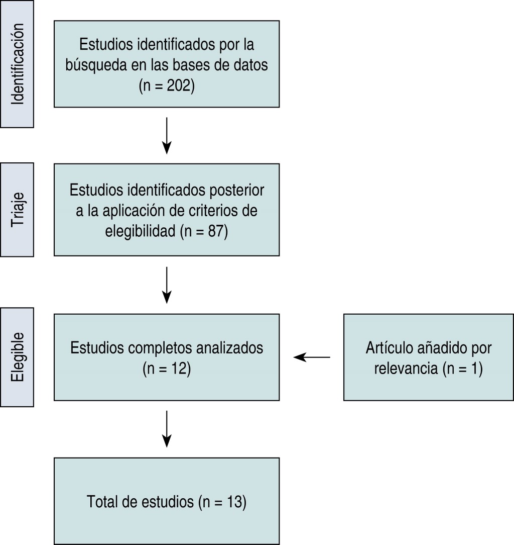 Se obtuvieron 202 artículos (PubMed, Elsevier, ScienceDirect) como criterios de elegibilidad fueron publicaciones en idioma inglés y en pacientes humanos; a la lectura de título y resumen se obtuvieron 12 artículos. Al revisar la totalidad del texto se añadió un artículo más por su relevancia en las citaciones, obteniendo un total de 13 artículos (Figura 1).