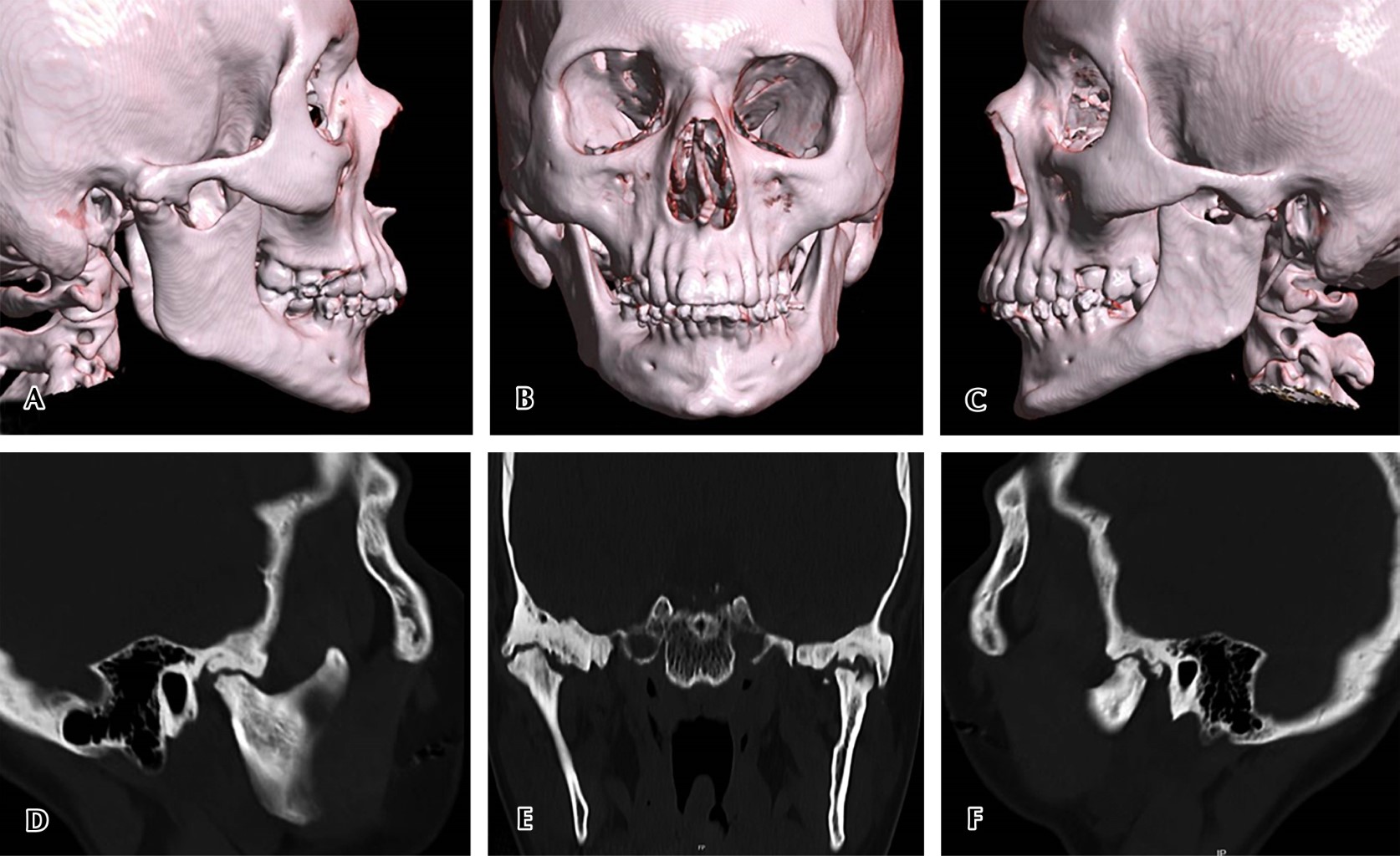 En su historial clínico, se documentaron múltiples infiltraciones intraarticulares con corticosteroides y ácido hialurónico como medidas conservadoras en su etapa inicial, además de al menos cuatro intervenciones quirúrgicas previas (dos en cada articulación) orientadas al desbridamiento articular y manejo de adhesiones; las cirugías realizadas incluían discopexia con anclaje de sutura, condilectomía alta, eminectomía y otras maniobras quirúrgicas con el objetivo de mejorar el cuadro de sintomatología. Sin embargo, estas intervenciones no lograron detener la progresión de la enfermedad ni mejorar los síntomas, por lo que se manifestó un deterioro progresivo de la función articular y aumento en la intensidad del dolor y restricciones funcionales severas. El escenario clínico e imagenológico se presentó con retroposición mandibular y pérdida de longitud vertical en sector posterior de la mandíbula, relacionado también con la reducción del volumen condilar (Figura 1).