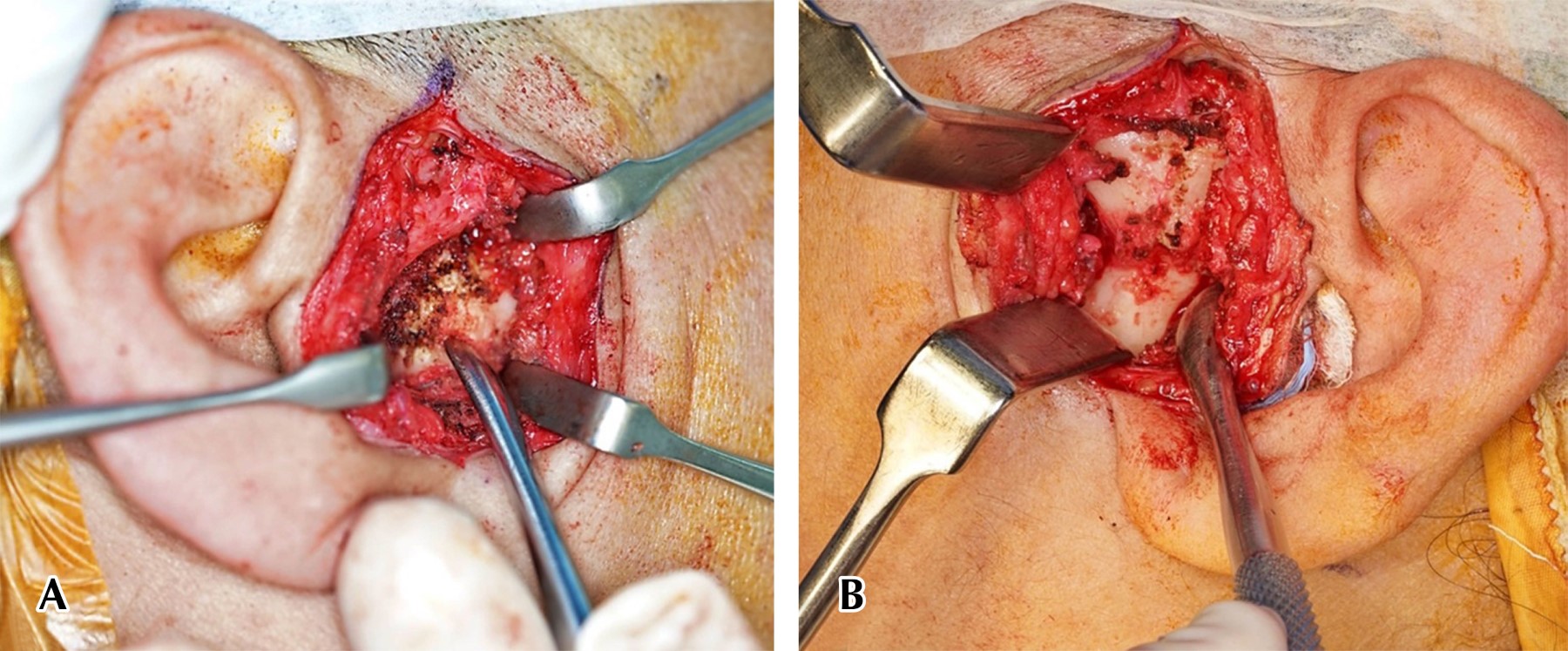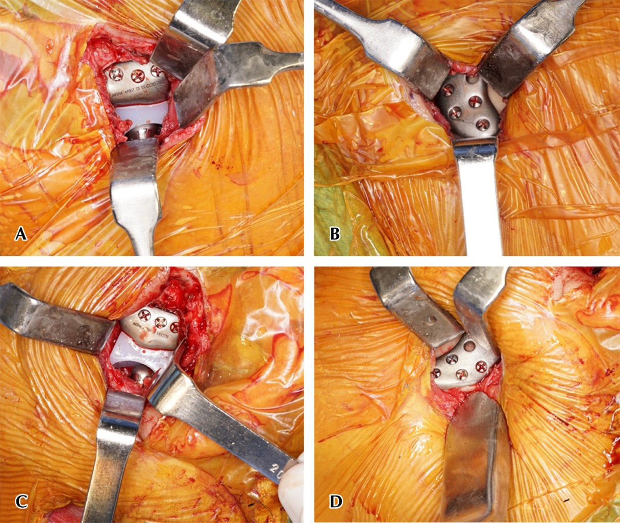 En esta condición de avanzado estado de deterioro articular y la persistencia de los síntomas, se decidió realizar un reemplazo articular total bilateral utilizando prótesis aloplásticas personalizadas (ATM Artfix Implants, Pinhais, PR, Brasil) (Figura 2). La cirugía fue realizada bajo anestesia general, siguiendo el protocolo habitual,6 mediante un abordaje endaural y submandibular. Durante el procedimiento, se observaron signos avanzados de degeneración articular, con pérdida significativa de la morfología condilar y adherencias severas (Figura 3). En el intraoperatorio se pudo constatar un correcto posicionamiento de los componentes protésicos (Figura 4), lo que fue constatado posteriormente a través de una tomografía de control (Figura 5).