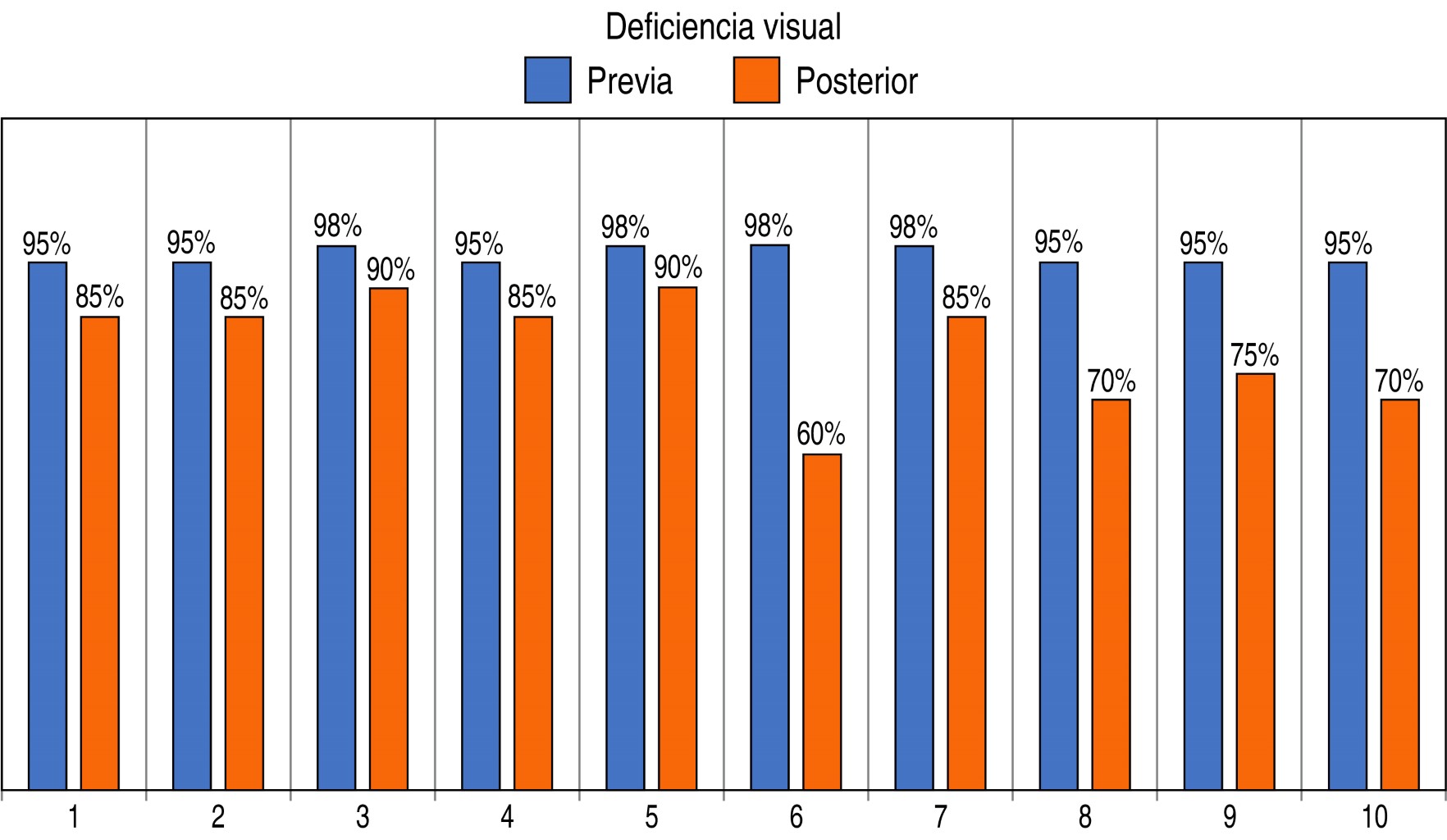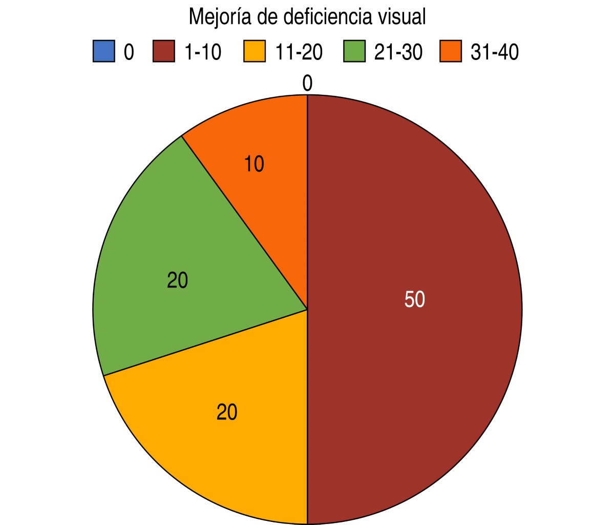 Se analizaron 10 ojos de nueve pacientes. El sexo más prevalente fue el masculino con 70% de la población y el femenino con 30%. La edad promedio de realización del procedimiento fue de 24.3 ± 7.22 años (Figura 1). En cuanto a la agudeza visual previa, se encontró que 100% de los pacientes se encontraban debajo de la métrica 20/200 en la tabla de Snellen, equivalente a un decimal menor a 0.10. En la estimación del porcentaje de deficiencia visual previo al procedimiento, 40% de los pacientes presentó percepción de movimiento de manos, esto correspondiente a una deficiencia visual de 98%. El otro 60% presentó cuenta dedos a 1 y 2 metros, clasificados en una deficiencia visual de 95% (Tabla 3). En la evaluación al mes posterior del procedimiento se registró mejoría en la totalidad de los pacientes, con un promedio de 16.7 ± 10.0, con un mínimo de 8% y un máximo de 38% (Figura 2). Finalmente, 50% de la población mejoró de 1-10% (Figura 3).