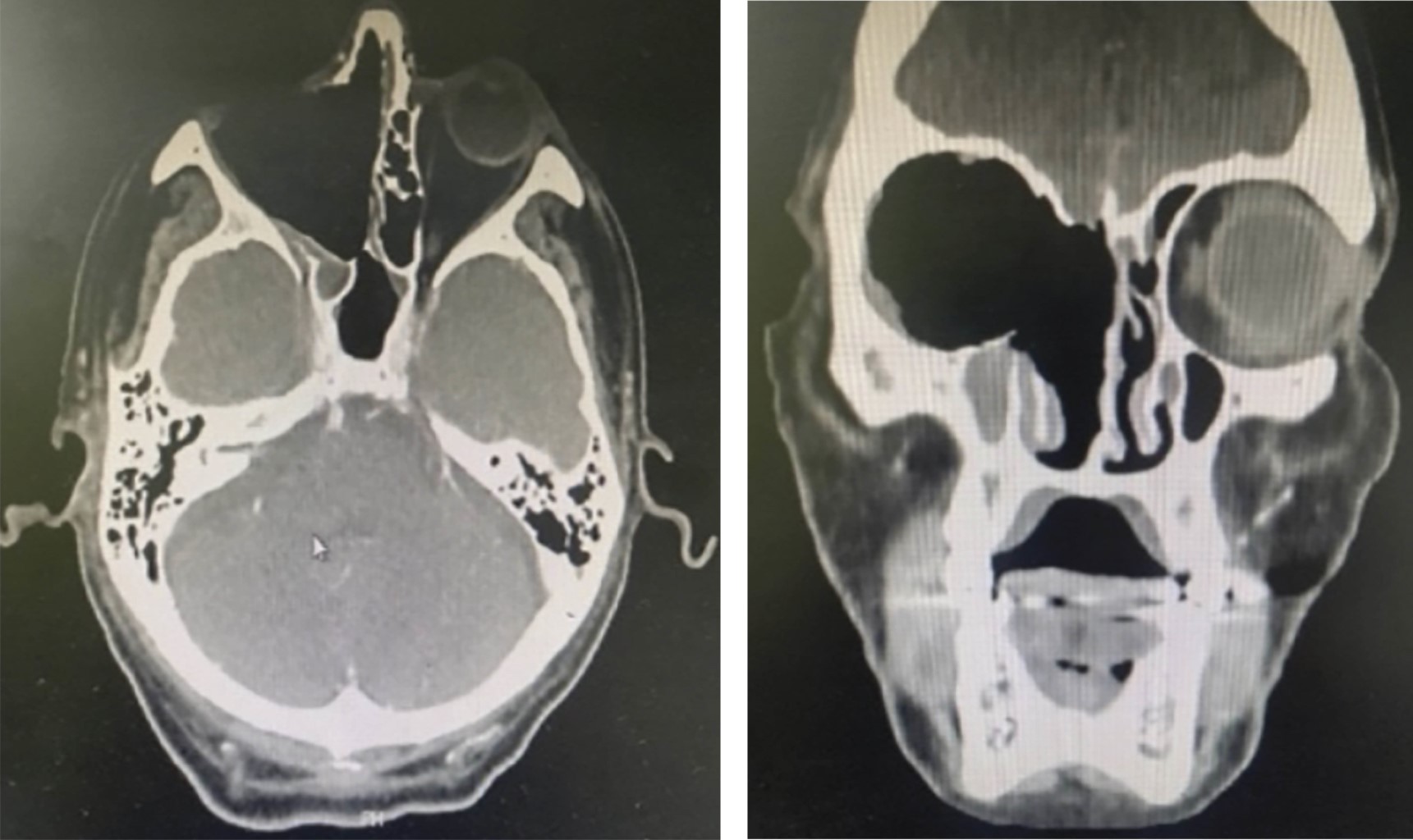 Posterior al trasplante (día 3) y aún bajo hospitalización, inicia con cefalea frontoparietal derecha intensa asociado con fotofobia, dolor retroocular, epífora, edema facial derecho, hipoestesia periocular ipsilateral, así como epistaxis, náusea y vómito, evoluciona a ptosis completa, proptosis en ojo derecho y disminución de agudeza visual (afección craneal múltiple). Es valorado por neurología, quienes descartan afección de sistema nervioso central (Figura 1), sugieren intervención por oftalmología, corroborando este último incremento de presión intraocular tratándolo con timolol/dorzolamida gotas oftálmicas (día 5-7), además de alta sospecha de síndrome de ápex. Servicio de órbita solicita imagen por resonancia magnética resultando en hipertrofia de cornete nasal derecho y ocupación maxilar derecho, celulitis orbitaria derecha, compromiso de vaina de nervio óptico y sinusitis etmoidal, esfenoidal y maxilar. Asimismo, es valorado por otorrinolaringología quien identifica múltiples úlceras palatinas derechas, isquemia de paredes, perforación de pared lateral e isquemia de tejido orbitario (Figura 2) en el día 7.