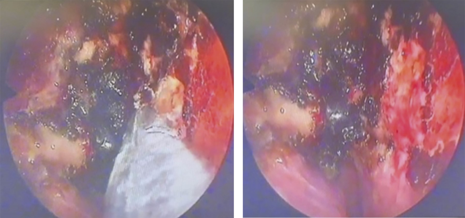 Es revalorada por el servicio de oftalmología (día 9) quienes realizan enucleación de globo ocular derecho; asimismo, el servicio cirugía de cabeza y cuello realiza cirugía funcional de nariz y senos paranasales (día 11), así como debridación de tejido necrótico. Posterior a corroborarse infección fúngica con Rhizopus, el servicio cirugía de cabeza y cuello en conjunto con el servicio de neurocirugía (día 15) realizan hemimaxilectomía derecha con colocación de placa frontotemporal derecha (por afección a nivel de sistema nervioso central e invasión a estos huesos). El servicio de infectología inició tratamiento con anfotericina B liposomal (desde el día 8), con evolución lenta por progresión de la enfermedad hasta la intervención por el servicio de neurocirugía y cirugía de cabeza y cuello.