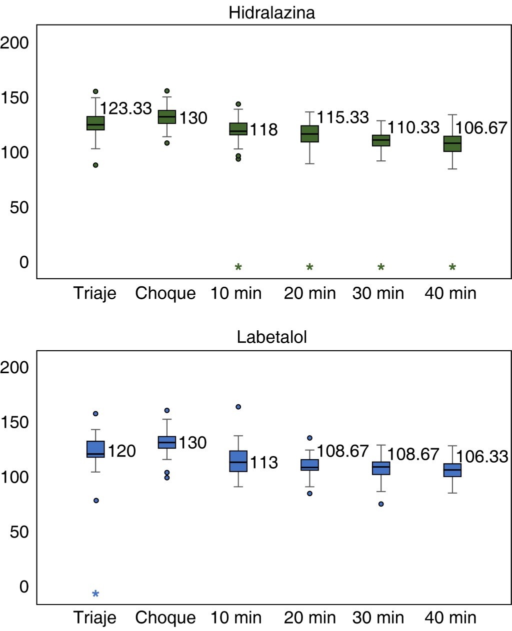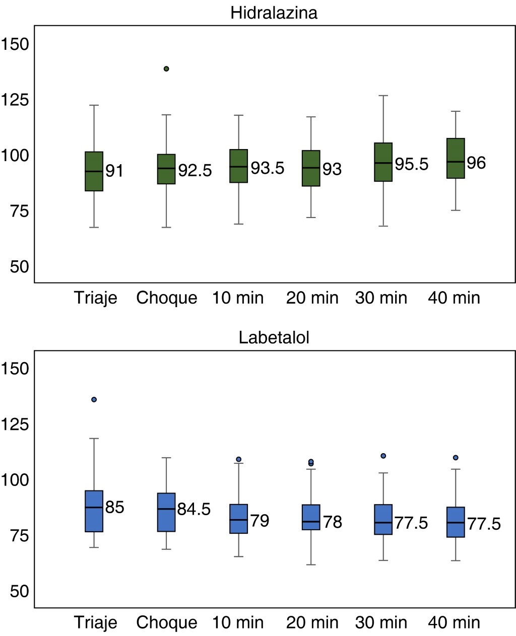 En cuanto al control de las variables hemodinámicas, ambos fármacos mostraron una reducción de las TAS, TAD, presión arterial media (TAM) y frecuencia cardiaca (FC) (p ≤ 0.001), comparando los valores iniciales en el servicio de triaje y los registrados al minuto 40 dentro de cada grupo; sin embargo, se observó que el control hipertensivo se lograba en un menor tiempo en el grupo de labetalol.