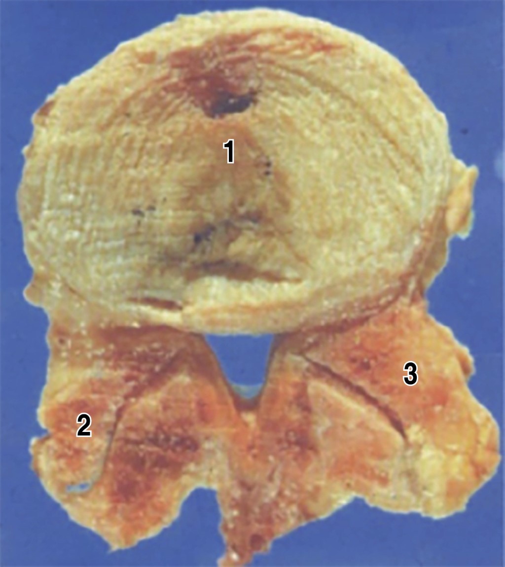 Kirkaldy-Willis y Yong-Hing especificaron que dentro de un segmento vertebral existe un complejo triarticular que comprende el disco intervertebral en su región anterior y las articulaciones posteriores conformadas por los complejos facetarios (Figura 1). La degeneración discal inicia a partir de desgarros anulares que avanzan a desgarros radiales. La herniación puede ocurrir cuando el núcleo pulposo sobresale o migra hacia la región perineural por medio de lesiones radiales del anillo fibroso. La solución interna del disco avanza a una disminución posterior de la altura del mismo disco y flacidez anular. La disminución de la altitud del disco modifica la biomecánica del complejo articular facetario, lo que provoca la generación de osteofitos en los bordes del disco. La cascada discal degenerativa en las articulaciones de las facetas se asimila a los cambios que acontecen en cualquier articulación de tipo sinovial, que progresa de la forma siguiente: inicia con la inflamación sinovial y avanza a la degradación del cartílago, abundante tejido capsular y subluxación del complejo articular. Los osteofitos hipertróficos se forman en los márgenes de las articulaciones facetarias y la fibrosis periarticular da como resultado articulaciones facetarias rígidas. Por consiguiente, la pérdida de la altura entre cuerpos vertebrales causa el engrosamiento del ligamento amarillo y la superposición de las facetas entre sí. La producción de las modificaciones degenerativas es de manera lineal en los tres componentes, lo que puede causar disminución de la luz de los canales foraminales y raquídeos provocando un efecto de compresión de las raíces nerviosas. Kirkaldy-Willis clasificó la cascada discal degenerativa en tres fases: fase de disfunción, etapa de alteraciones funcionales con cambios anatómicos pequeños; fase de inestabilidad, que se traduce a una mayor degeneración discal, los complejos facetarios y los complejos ligamentarios; por último, la fase de estabilización, mediante la producción de osteofitos y degeneración fibrótica de las facetas y el disco intervertebral (Tabla 1).3