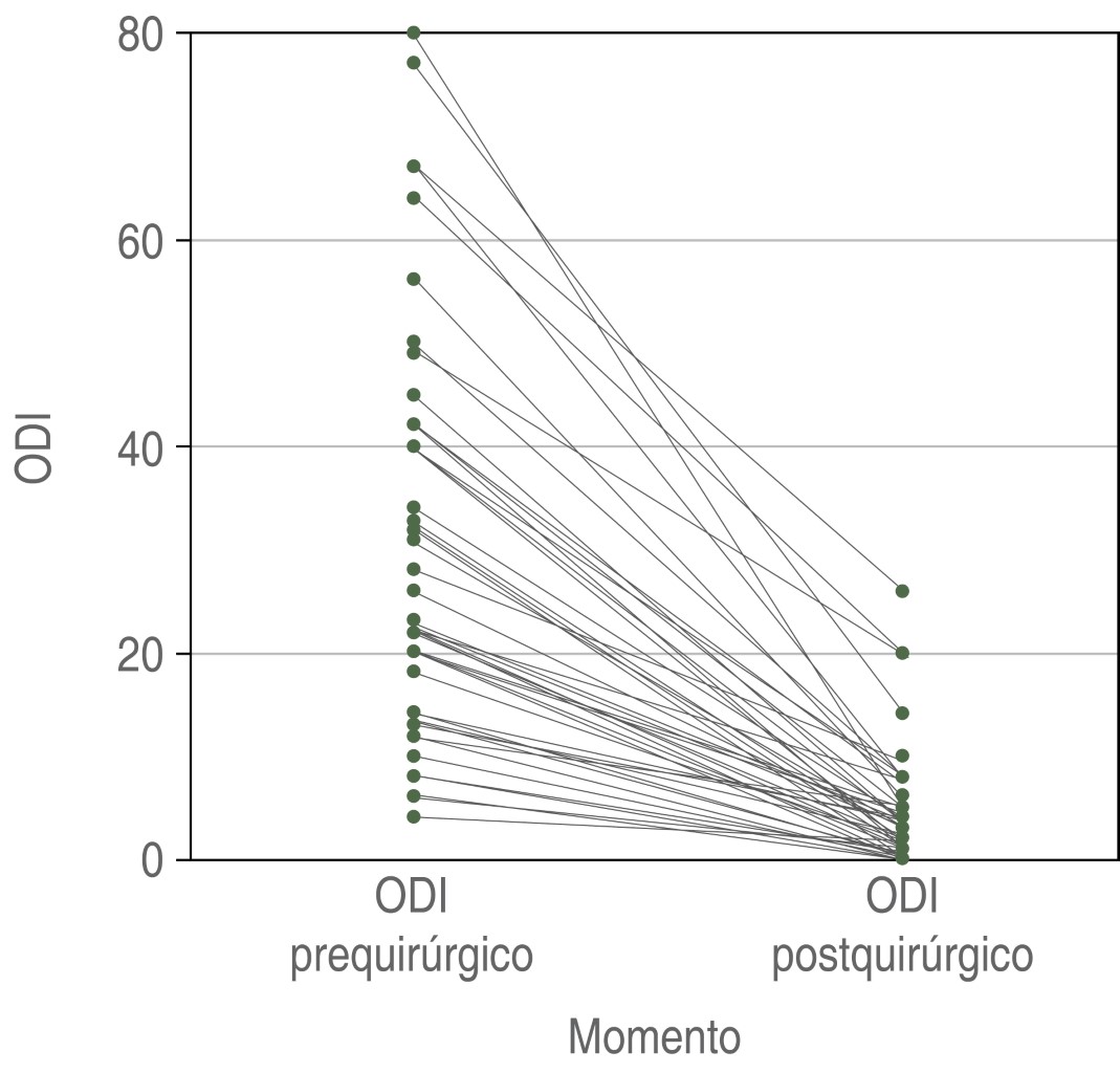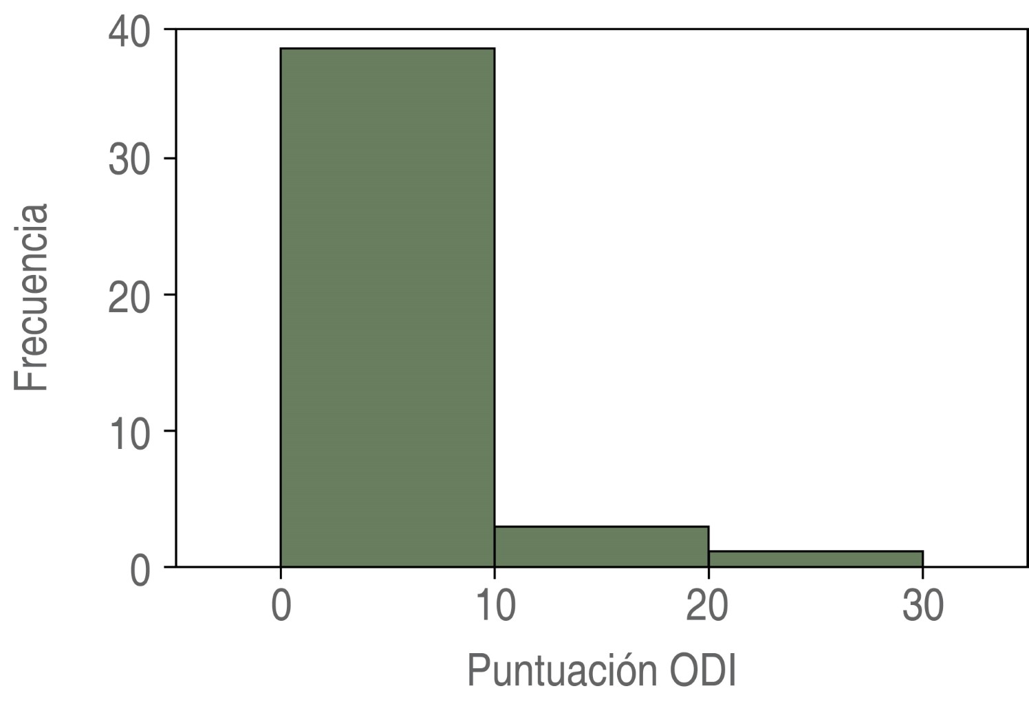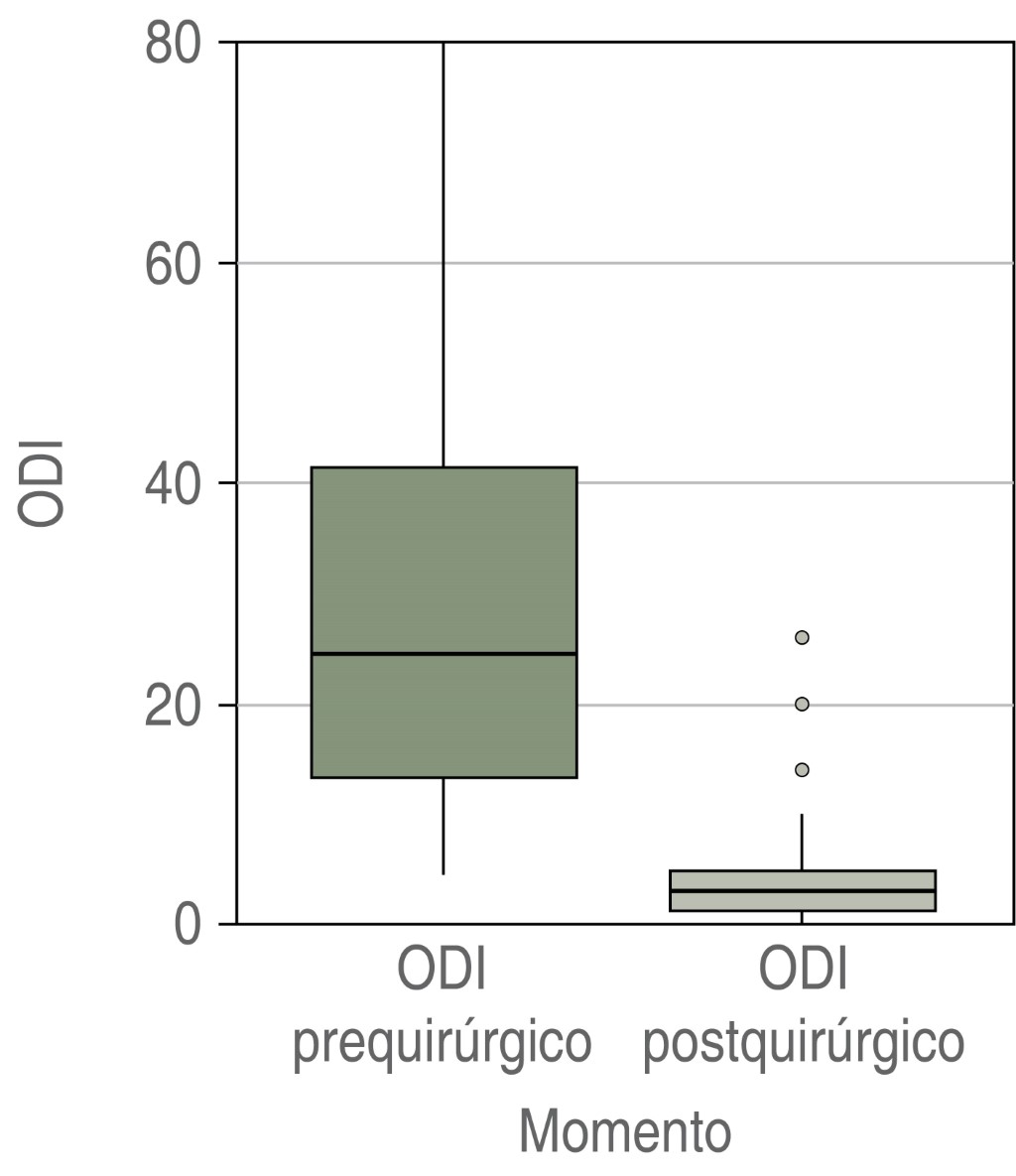 ODI pre y post: dado que p < 0.05, los datos no siguen una distribución normal. Por ello, se destaca la mediana como estadístico más adecuado: 24.5 puntos, con un amplio rango intercuartílico [RIC] (28.25), lo que sugiere una variabilidad considerable en el grado de discapacidad que presentan los pacientes antes de la cirugía. La media (30.05), aun siendo un valor referencial, confirma la dispersión alta (desviación estándar [DE] = 20.28). Tras la intervención, el ODI muestra un descenso marcado respecto al preoperatorio: la mediana baja a 3, con un RIC de 4. Esto indica que, en la mayoría de los casos, la discapacidad residual tras la cirugía es muy limitada. La reducción de la dispersión comparada con los valores prequirúrgicos refuerza la idea de que la mayoría de los pacientes mejoró significativamente su funcionalidad. ODI pre (mediana = 24.5) vs ODI post (mediana = 3). Se observa una mejora clínicamente relevante en la escala de discapacidad Oswestry tras la cirugía (Figuras 2, 3 y 4).