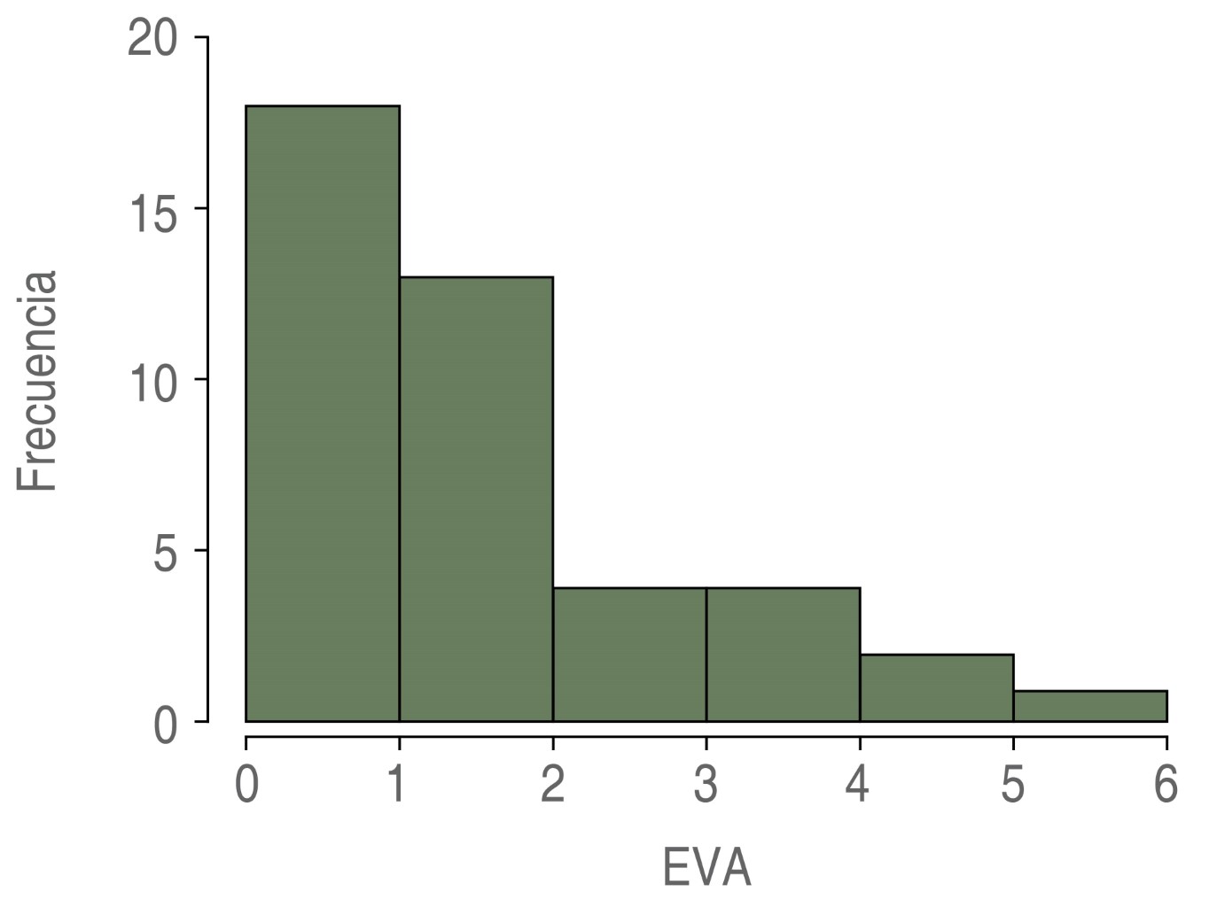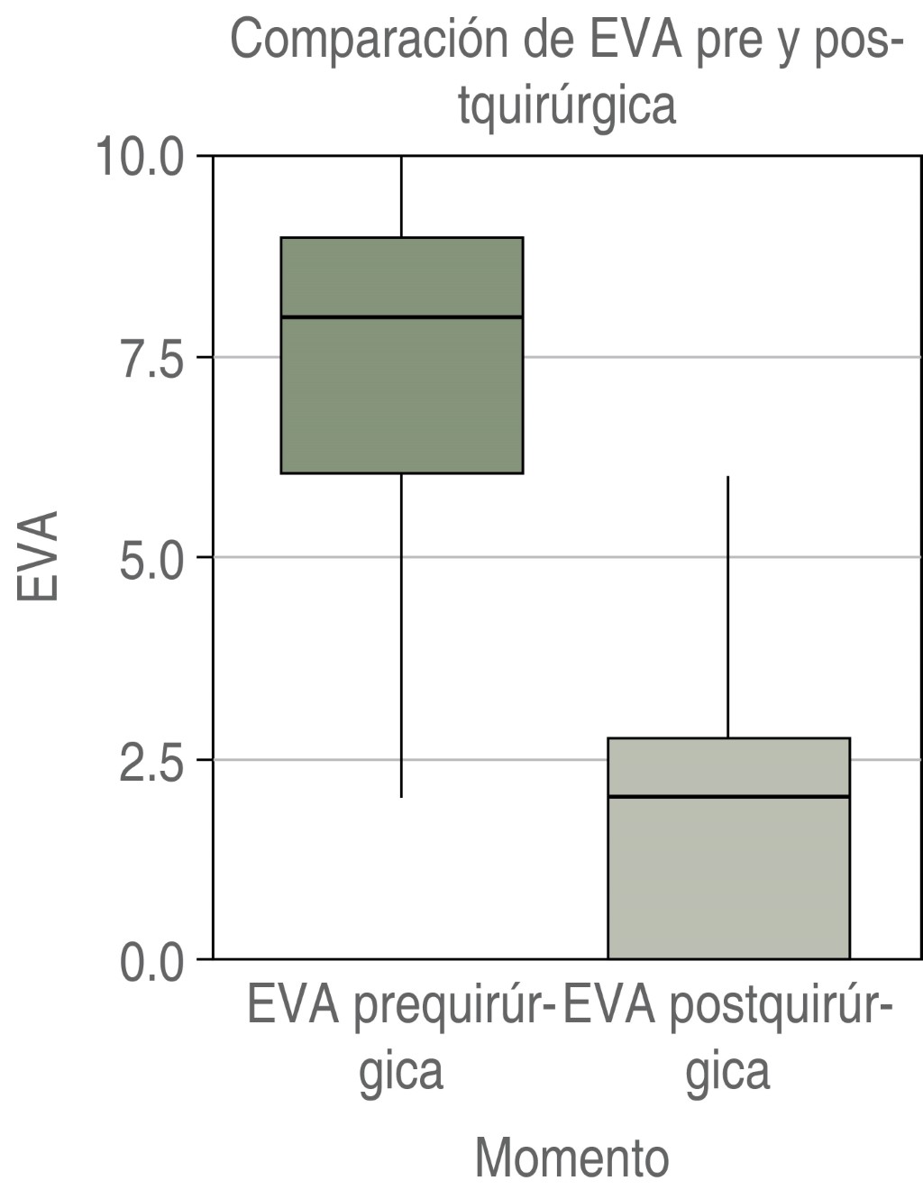 EVA pre y post: los valores prequirúrgicos de EVA muestran que la mayoría de los pacientes tenía dolor intenso (mediana = 8 sobre 10). La amplitud de la RIC (3) sugiere que algunos pacientes reportaron EVA más moderadas (por ejemplo, 5 o 6), mientras que otros llegaron a valores máximos (10). En el periodo postoperatorio, la EVA disminuyó notablemente: la mediana se ubica en 2, con un RIC de 2.75. Llama la atención que el rango máximo sea de 6, lo cual indica que ningún paciente refiere dolor "máximo" (≥ 7) tras la cirugía. EVA pre (mediana = 8) versus EVA post (mediana = 2). El descenso en la puntuación de dolor se alinea con la mejoría funcional observada en el ODI, apoyando la efectividad del abordaje quirúrgico (Figuras 5, 6 y 7).