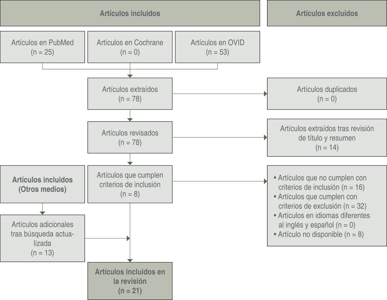 Para realizar la revisión bibliográfica se realizó un proceso de búsqueda de literatura y de selección de artículos; se utilizaron las palabras clave: gunshot/gunshot wounds, spine y epidemiology en PubMed, Cochrane y OVID de los últimos cinco años. Los artículos fueron revisados por tres autores independientes con base en los siguientes criterios de inclusión: 1) datos epidemiológicos del mecanismo de lesión de las heridas por arma de fuego, 2) presentación clínica de las lesiones de columna vertebral por arma de fuego, 3) métodos diagnósticos de las lesiones de columna vertebral por arma de fuego y 4) manejo médico e indicaciones quirúrgicas de las lesiones de columna vertebral por arma de fuego. Las editoriales, artículos sin texto completo, artículos preaprobados y artículos escritos en idiomas diferentes al español e inglés fueron excluidos. Se identificaron 78 artículos, de los cuales sólo ocho cumplieron con los criterios de inclusión; a éstos se adicionaron 13 artículos extraídos de otros medios, sumando un total de 21 artículos para la revisión bibliográfica (Figura 2).