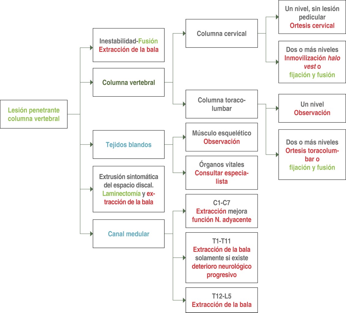 El tratamiento inicial de las lesiones por arma de fuego en la columna vertebral comienza con la estabilización hemodinámica del paciente, pasando por la evaluación de varios puntos clave para decidir si es necesario realizar una cirugía. Estos puntos incluyen el estado neurológico del paciente, la estabilidad de la columna, la localización del proyectil y el nivel de la lesión.11