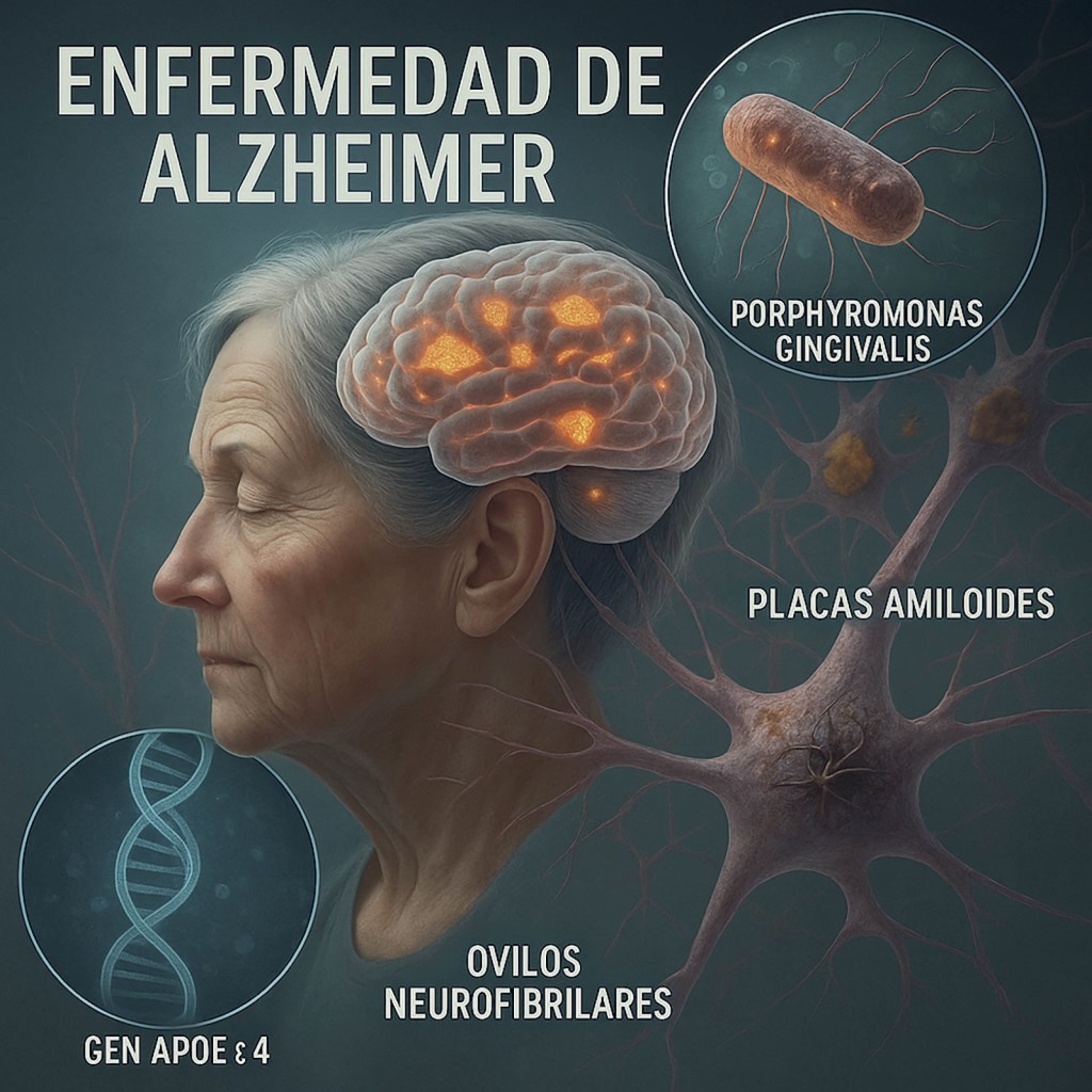 Las alteraciones vasculares, la disfunción mitocondrial, el estrés oxidativo, la utilización reducida de la glucosa cerebral y la neuroinflamación pueden desempeñar un papel en el inicio y la progresión de la enfermedad. La periodontitis puede ser un factor de riesgo en el inicio y progresión de la enfermedad de Alzheimer debido a la inflamación crónica y los factores de virulencia de los microorganismos periodontopatógenos que favorecen la afección general, se presenta clínicamente con depresión y deterioro cognitivo, y en la autopsia se evidencian dos lesiones neuropatológicas distintivas.