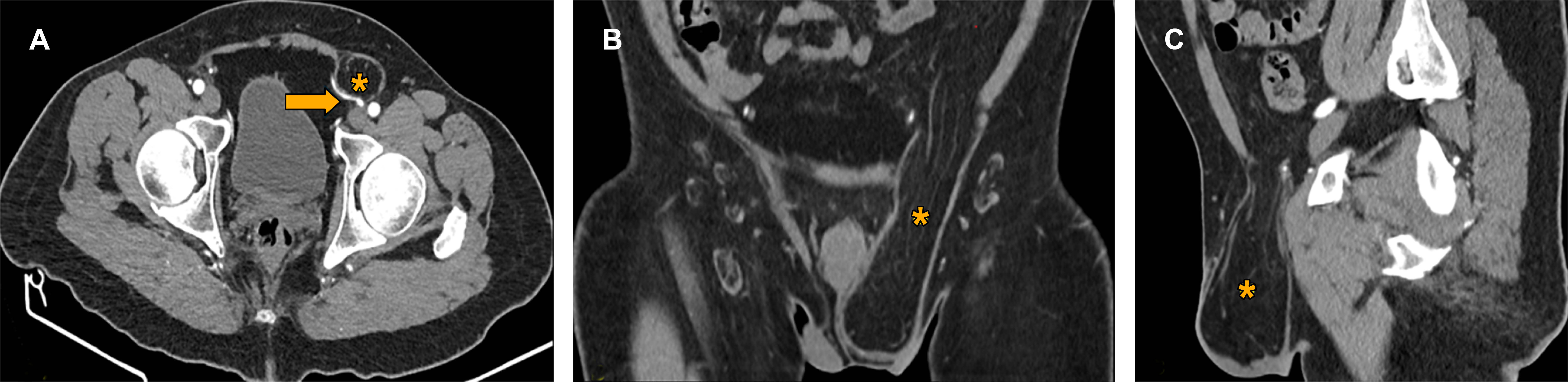 En el estudio de Miyaki y su equipo,14 en el que incluyeron 79 pacientes operados en búsqueda de hernias inguinales por TC, en posición prono, para detectar y clasificar hernias ocultas, se observan diferencias respecto a nuestro estudio, donde también se diagnosticaron hernias inguinales, aunque las imágenes fueron tomadas en posición supina, debido a que fue un estudio retrospectivo. Esto contrasta con el estudio mencionado, el cual se realizó en tiempo real. Lo anterior resalta que la TC sigue siendo una herramienta eficiente para el diagnóstico de hernia inguinal, tanto en posición supina como en prono.