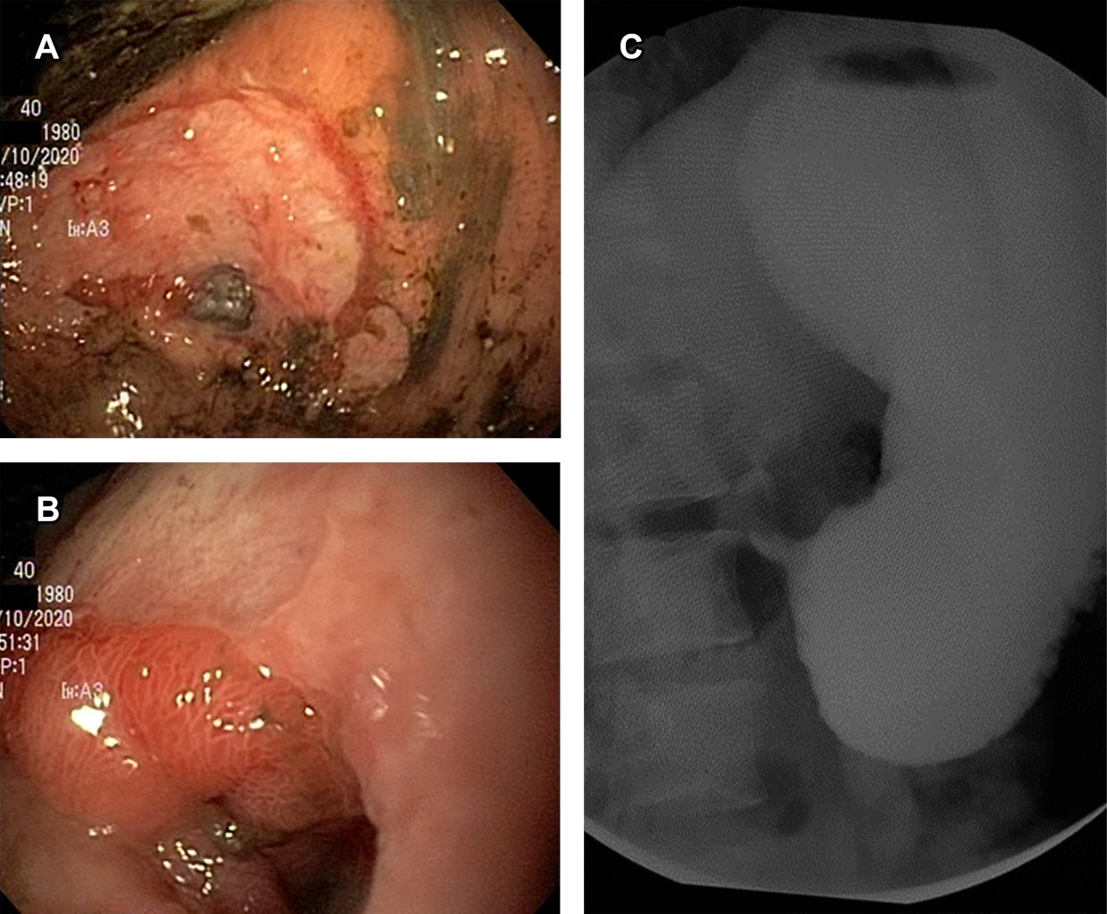 La serie esofagogastroduodenal mostró paso filiforme de contraste hacia el píloro (Figura 1C). La tomografía computarizada de tórax y abdomen reportó engrosamiento de la mucosa del antro y bulbo duodenal y ganglios de aspecto inflamatorio.