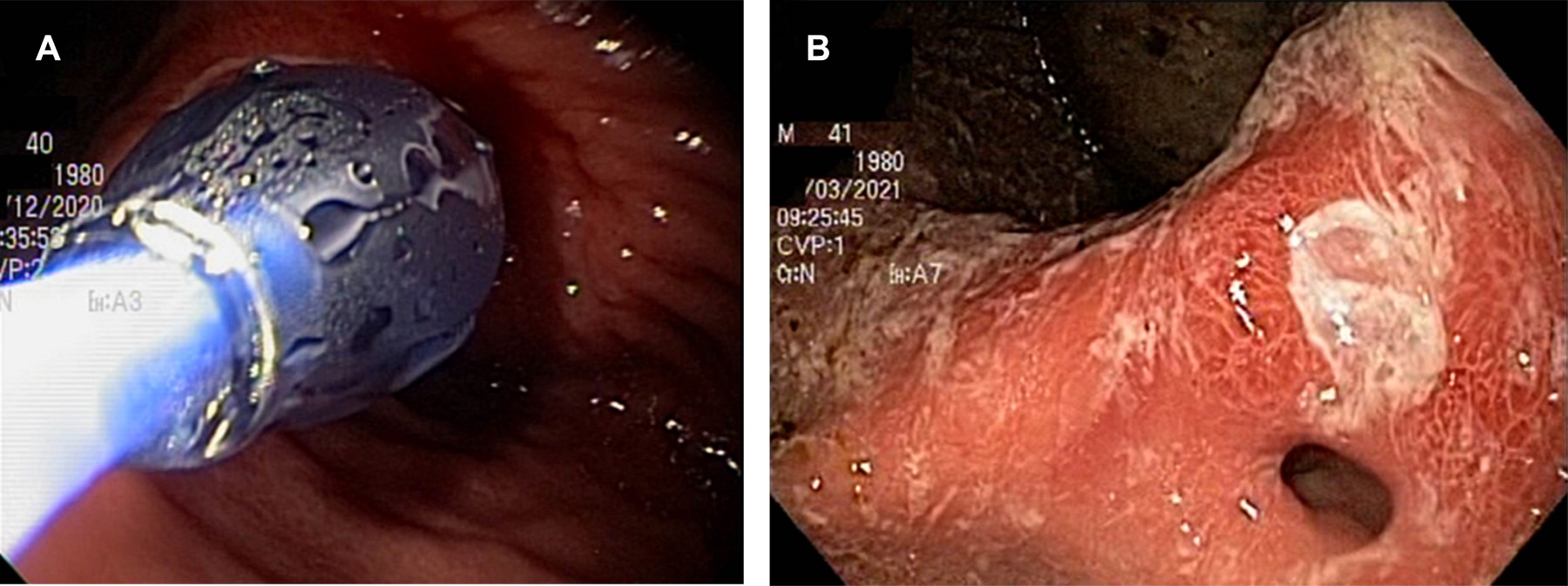Los laboratorios mostraron anemia hipocrómica microcítica grado II y antígeno carcinoembrionario 0.96 ng/mL. Se efectuaron panendoscopias, la inicial (Figura 1A y B), a los 15 días con dilatación, a los dos meses con dilatación y a los tres meses. La inicial mostró zona de ulceración desde la incisura angularis hasta el píloro, con sangrado, sin permitir paso del panendoscopio.