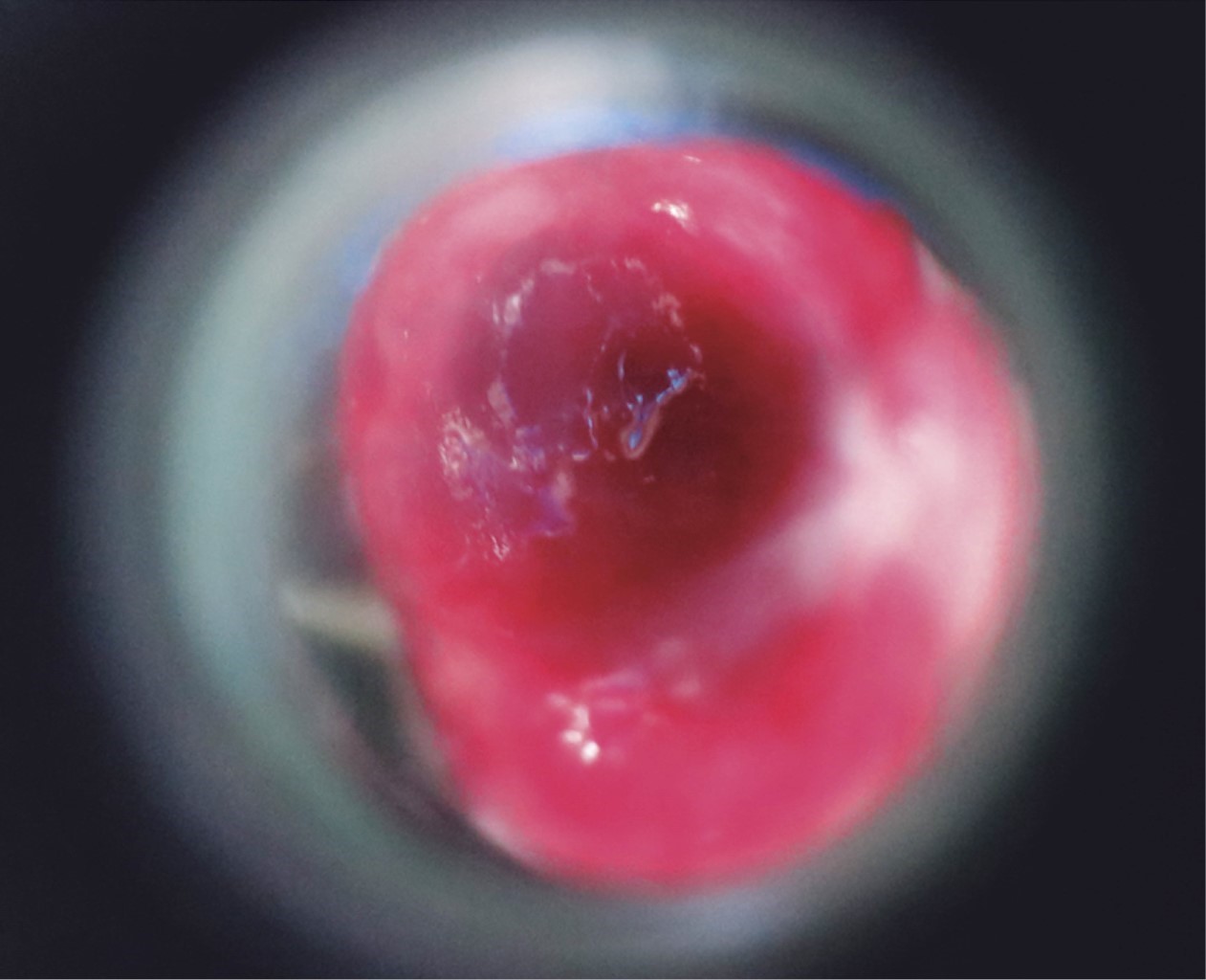 Se trata de un paciente del sexo masculino, de 30 años de edad, soltero, originario y residente de la Ciudad de México, quien acude por una dermatosis localizada a tronco, del que afecta área genital, y de ésta el prepucio del lado derecho. Dermatosis constituida por una neoformación de 3 × 1.5 × 1 cm, de aspecto vascular, eritematosa, pediculada, simétrica, de bordes regulares bien circunscritos, de superficie lisa brillante, con algunas áreas blanquecinas y algunas exulceraciones. De evolución aguda y dolorosa (Figuras 1 y 2). El resto de la exploración de piel, anexos y la revisión física general, sin alteraciones.