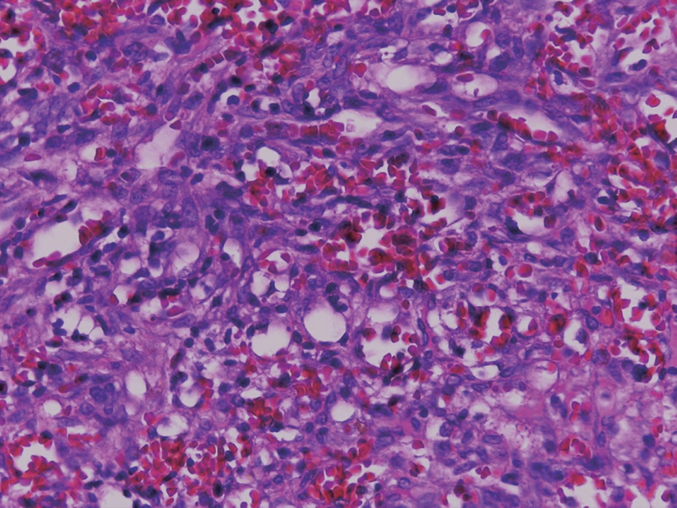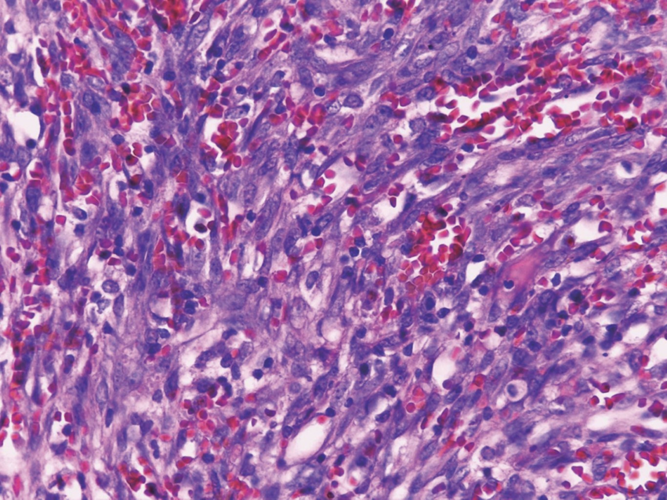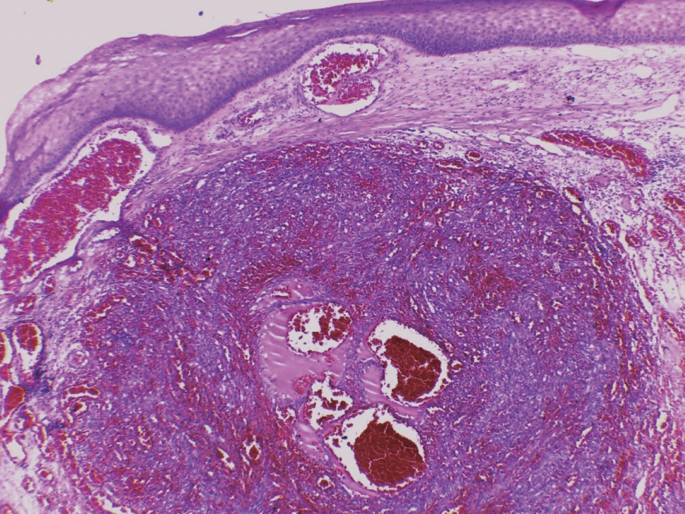 El tratamiento fue mediante escisión por rasurado y electrocauterización (Figura 4). En el estudio histológico se observó una neoformación exofítica cuya epidermis presenta hiperqueratosis paraqueratósica focal, atrofia y zonas ulceradas. En el espesor de la dermis se observan numerosos vasos neoformados dilatados y congestionados cuya pared se encontró formada por una sola hilera de células endoteliales, los cuales se entremezclan con numerosas células fusiformes que siguen diversos trayectos inmersos en un estroma edematoso (Figuras 5, 6 y 7).