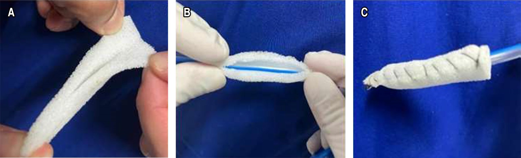 De marzo de 2023 a septiembre de 2024, se llevó a cabo la TPNE en 11 pacientes, de los cuales 63.64% (7/11) fueron hombres, mientras que 36.36% (4/11) fueron mujeres, el promedio de edad en años fue de 52 ± 12.57 (28-73) (Tabla 1). La causa más frecuente para la colocación de TPNE fue postquirúrgica 81.82% (9/11), mientras que 18.18% (2/11) fueron traumáticas. El sitio más común de perforación fue el estómago 36.36% (4/11), seguido del esófago 27.27% (3/11) y recto 18.18% (2/11). Por otro lado, 72.73% (8/11) tuvo perforación en tracto gastrointestinal superior, mientras que 27.27% (3/11) en el tracto gastrointestinal inferior. La técnica utilizada para la colocación de la TPNE en tracto gastrointestinal superior e inferior fue una modificación de la técnica descrita por Sendino y colaboradores.10 Brevemente, se utilizaron EAPV de poros cerrados menores a 200 micras montada y confeccionada a sonda nasogástrica de entre 12-16 French (Fr), con cierre lateral de la esponja mediante polipropileno o seda del 2-0 mediante puntos continuos (Figura 1) para una calibración adecuada de la misma, realizando la colocación por orificio nasal con exteriorización por boca de sonda nasogástrica y fijación de esponja para su colocación en TD superior (Figuras 2 y 3) o con inserción de esponja montada en el caso de afección a TD inferior. Para ambos casos, se utilizó presión negativa continúa controlada entre 60-120 mmHg.