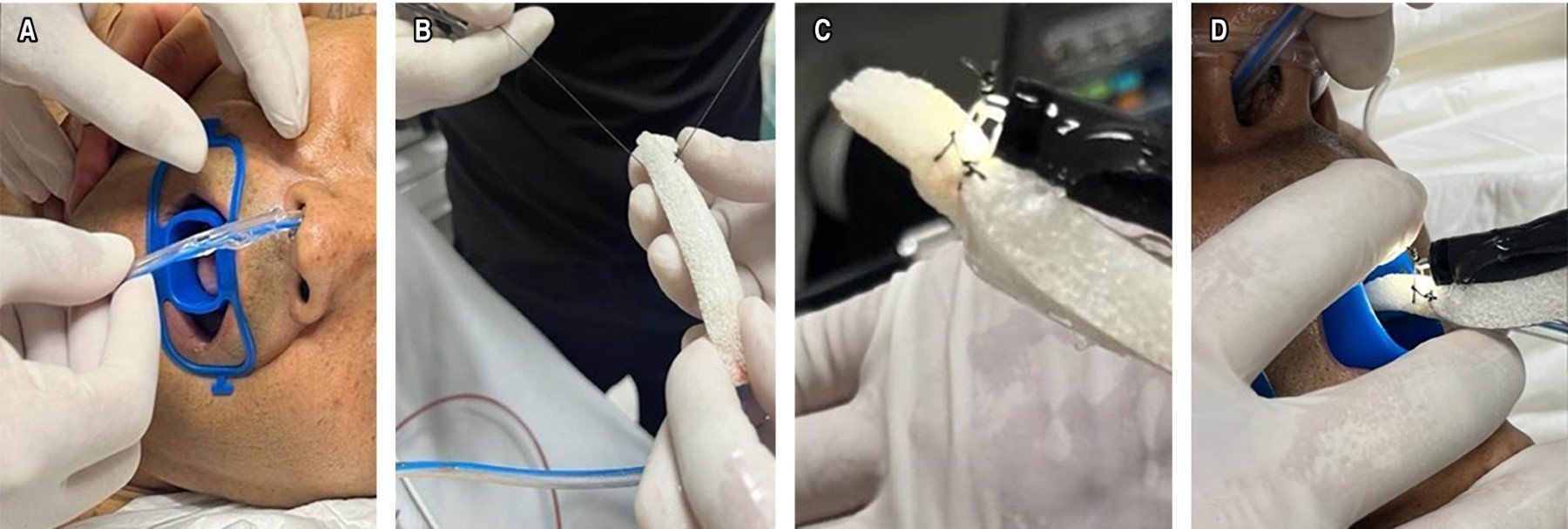 La técnica de recambio descrita en TD superior constó de una panendoscopia diagnóstica y sujeción de EAPV con pinza de cuerpo extraño, se exteriorizó por cavidad oral y se cortaron los extremos de la sonda nasogástrica 3 cm alejados de cavidad oral y nasal para su paso por una guía hidrofílica de 25-35 mm y retirar la sonda nasogástrica. Se introdujo la nueva sonda nasogástrica por narina ferulizada y se exteriorizó por cavidad oral para el montaje (Figura 4).