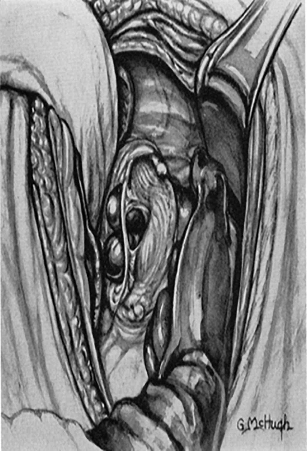 Estudio específico de la rama gástrica del vago y el nervio de Latarjet: utilizando bases fisiológicas y anatómicas antes descritas, André Raphaël Latarjet (1877-1947) y Wertheimer se embarcaron en el estudio del nervio vago en la aparición o empeoramiento de las úlceras pépticas, para dicho estudio utilizaron animales para la descripción de las ramas terminales gástricas del vago, y observar si tiene algún factor en la aparición de éstas27,28 (Figura 2). Al momento de que el vago llega al abdomen, por medio del hiato y el esófago, en forma del plexo esofágico, describió el nervio vago anterior en la curvatura menor, siguiendo dicha cara gástrica. En el trayecto se iban proyectando 2-12 ramas a la cara anterior del estómago,29 a nivel del píloro y la primera porción del duodeno proyectaba sus ramas terminales, los cuales, al momento de describirlos denominó esta sección "pata de ganso". Dicho nervio descrito ha tomado el nombre del nervio anterior de Latarjet y la pata de ganso. Latarjet y Wertheimer realizaron la primera vagotomía troncular terapéutica para el tratamiento de úlceras duodenales y pilóricas. Y registraron la principal complicación de las vagotomías truncales, paresia gástrica. Al momento de dicho descubrimiento no se sabían las bases fisiológicas del porqué. Pero descubrieron que la vagotomía disminuía la aparición y complicaciones de las úlceras pilóricas, por la hiposecreción de ácido gástrico. En Francia, Lyon, el Dr Jaboulay (1914), realizó la primera vagotomía en humanos, para disminuir el dolor abdominal.7 Tuvieron que pasar 20 años para que el Dr. Lester R. Dragstedt y Frederick Owens, en Estados Unidos de América, teorizaran del porqué aparecen dichas úlceras, entre dichas teorías se encuentran la hipersecreción de ácido clorhídrico con un aumento basal de secreción gástrica,30,31 siendo factores fisiopatológicos importantes en la aparición, pero no son los únicos. Por lo que, siguiendo los estudios y resultados de Latarjet, hace 20 años, utilizaron la vagotomía truncal supradiafragmática para el tratamiento de úlceras pépticas, duodenales y gástricas el 18 de enero de 1943. Al igual que sus maestros, la principal complicación es paresia gástrica. Realizando una modificación a la vagotomía, se agregó una piloroplastía o gastroenteroanastomosis para dicha paresia. Y, no fue hasta 1957, con Griffith y Harkins que explicaron la importancia del nervio anterior de Latarjet en la secreción ácida y la motilidad gástrica. Observaron que las ramas del nervio de Latarjet inervan a las células parietales del cuerpo gástrico, y a nivel pilórico y duodenal a células parietales y motoras, encargadas del vaciamiento gástrico.32