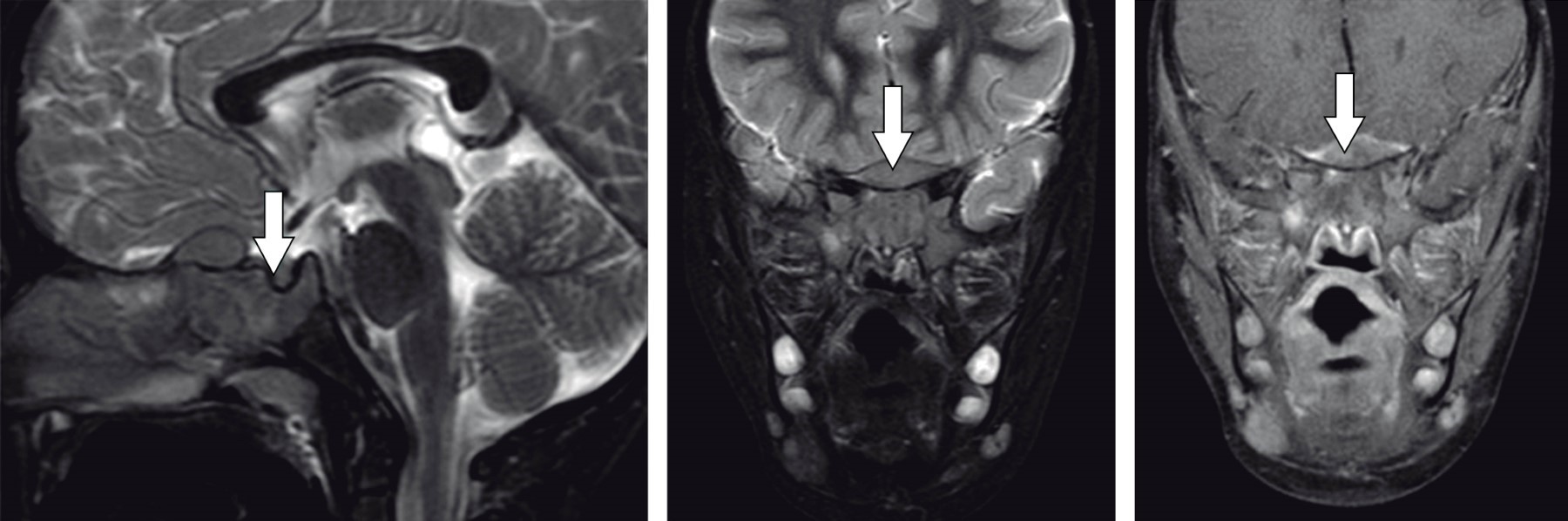 El servicio de oftalmología confirma oftalmoplejía completa del ojo derecho, con probable alteración de los pares craneales III, IV y VI. Pero la agudeza visual y fondo de ojo se consideraron normales. Por lo anterior, se decide realización de tomografía de cráneo y órbitas con medio de contraste, la cual mostró una lesión ósea esfenoidal con componente de partes blandas intracraneal. Se consideró diagnóstico de linfoma, pero se tenían que descartar otros diagnósticos como rabdomiosarcoma, histiocitosis de células de Langerhans o metástasis de neuroblastoma. Tres días después se efectúa resonancia magnética (RM) de cráneo, que apunta hacia la misma hipótesis diagnóstica (Figura 1). Por los hallazgos en estudios de imagen de una lesión muy probablemente de origen tumoral en seno esfenoidal se realizó biopsia, mediante abordaje endoscópico transetmoidal.