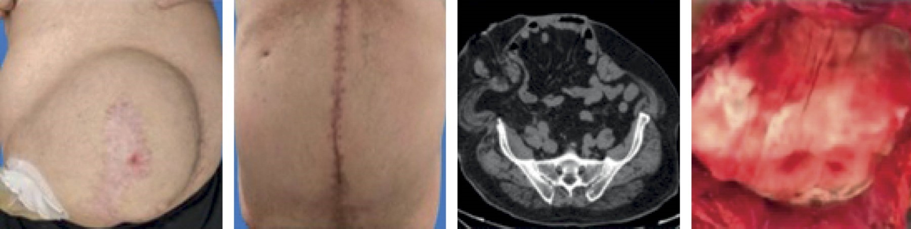 Caso 1. Hombre de 45 años, con antecedentes crónico degenerativos negados; antecedentes quirúrgicos positivos para laparotomía exploradora cuatro años previos. Inició padecimiento actual un año antes del evento quirúrgico con aumento de volumen en el sitio de la laparotomía previa, no doloroso, de 40 × 18 cm. Fue protocolizado por el servicio de cirugía general, realizando plastia ventral con separación anatómica de componentes, según la técnica de Carbonell-Bonafé. Requirió protocolo prequirúrgico con neumoperitoneo progresivo + reconexión de tránsito intestinal. Inició la vía oral tres días después del evento quirúrgico. Durante el cuarto día postoperatorio se presentó infección de herida quirúrgica, que requirió lavado quirúrgico en tres ocasiones. Egresó al séptimo día postoperatorio sin complicaciones posteriores a su egreso (Figura 1).
