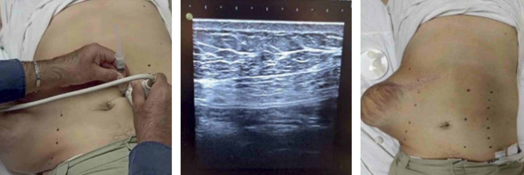 - 1. Infiltración de 100 UI de toxina botulínica tipo A (500 UI en caso de Dysport), en cada lado de la pared abdominal (guiada por ultrasonido, 21 días previos a la cirugía).9