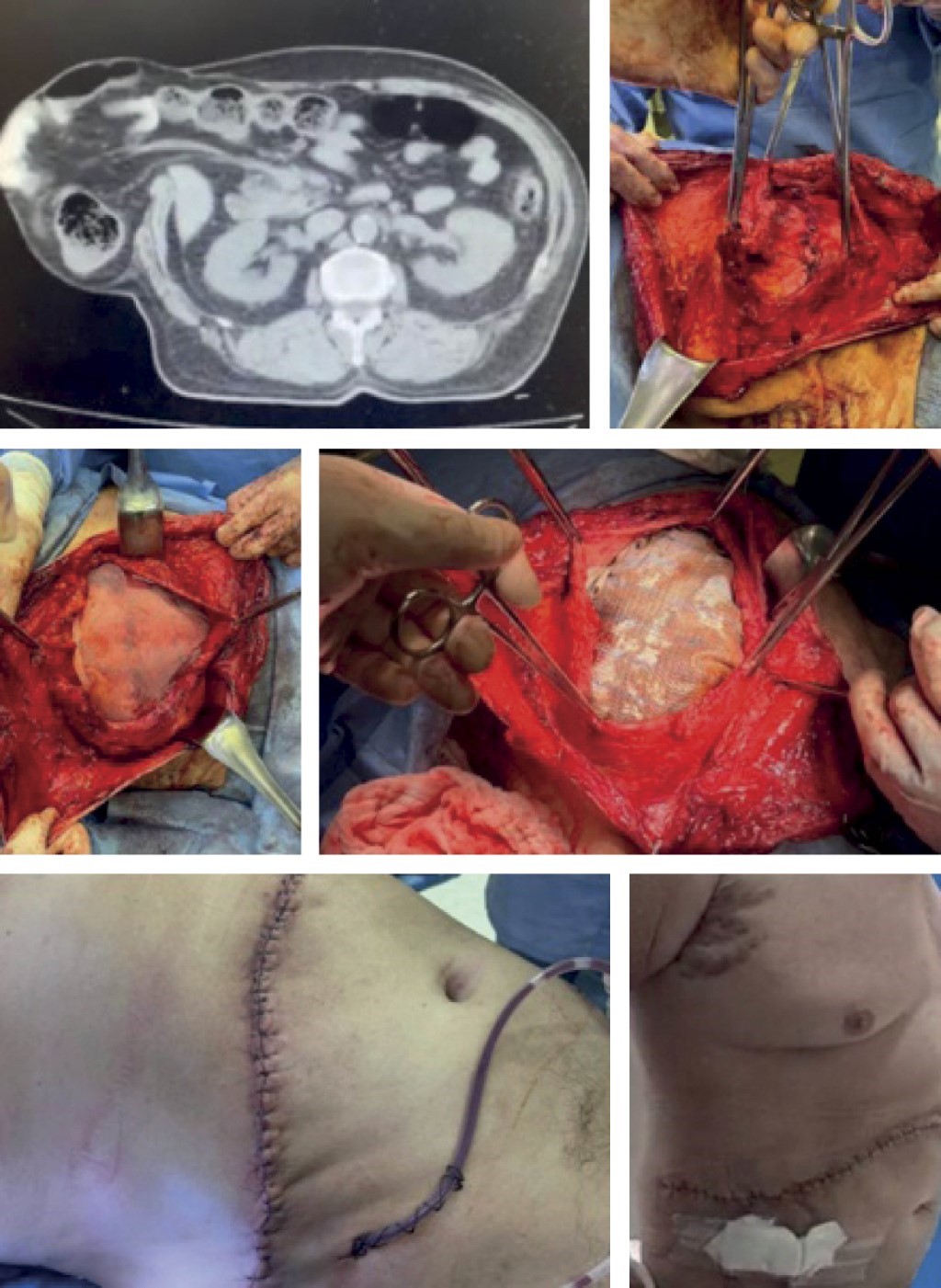 Caso 4. Mujer de 67 años, con antecedentes crónico-degenerativos positivos para diabetes mellitus tipo 2, en tratamiento con metformina 850 mg cada 12 horas y antecedentes quirúrgicos negados. Inició su padecimiento actual con la aparición de una masa en la región infraumbilical, retráctil, no dolorosa, de 20 × 15 cm. Se realizó plastia con colocación de malla de PROCEED 30 × 30, más separación de componentes, sin presentar complicaciones postoperatorias. Egresó a las 48 horas después del evento quirúrgico.