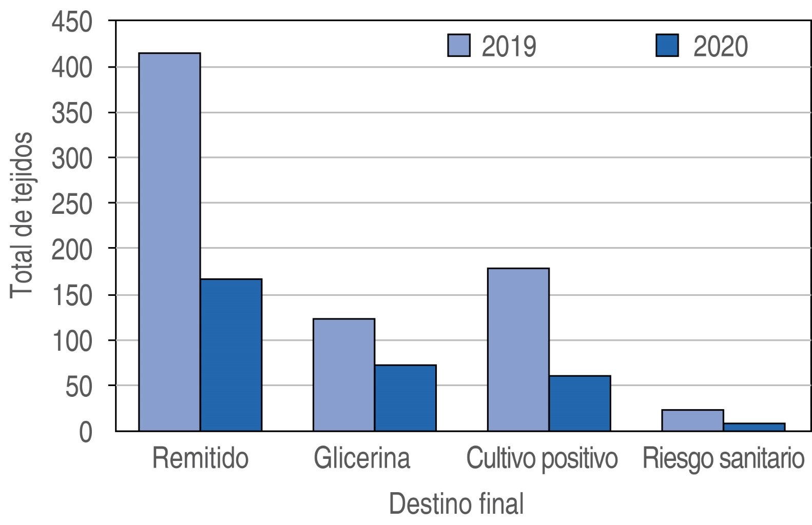 El total de tejido corneal asignado al Banco fue 744 tejidos en el año 2019 y 310 en el 2020. Total de tejido corneal con uso en trasplante, 415 tejidos (55.77%) en 2019 y 167 tejidos (53.87%) en 2020. Total de tejido con cultivo positivo, 182 (24.46%) en 2019 y 61 tejidos (19.67%) en el 2020. Total de tejido desechado por riesgo sanitario, 23 tejidos (2.09%) en 2019 y ocho (2.58%) en 2020 (Tabla 1).