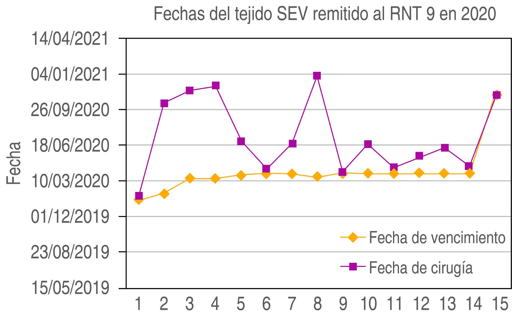 De los tejidos remitidos sin endotelio viable al RNT 9 en el año 2020, se observa que los tejidos con fecha vigente del medio de preservación (tejido fresco) en el quirófano representaron 61%, mientras que los tejidos con fecha de caducidad cumplida (glicerina) constituyeron el 37% (n = 15) de los tejidos en total (Figura 2).