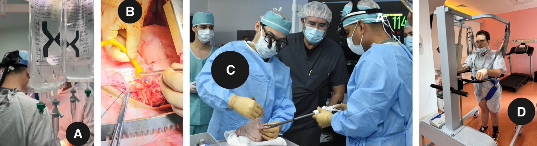Bajo consentimiento informado y aprobación por los comités de ética y trasplante hospitalarios, con paciente en posición de supino modificada por un bulto transversal torácico, anestesia general, intubación selectiva y monitoreo anestésico para procedimiento cardiovascular mayor, 3 además de Swan-Ganz, ecocardiograma transesofágico, neuromonitoreo y línea arterial, se colocaron introductores arteriales y venosos femorales derechos, se realizó incisión de Clamshell y se procedió a disección del hilio pulmonar, se administraron 5,000 UI de heparina y 500 mg de metilprednisolona, se realizó prueba de pinzado de arteria pulmonar con pinza Satinsky por cinco minutos, sin evidenciar incremento de la presión de arteria pulmonar, inestabilidad hemodinámica o ventilatoria, se colocó una rienda de poliéster del 5 al domo del diafragma para tracción por contraabertura. En la neumonectomía derecha, se cortó arteria, vena y bronquios con cartuchos de 45 mm de engrapadora endocavitaria con grapas de 2.5 mm a vasos y 3.8 a bronquios. Se confeccionó muñón bronquial de receptor preservando tejido peribronquial y cauterizando lo menos posible el borde libre. Se procedió a introducir injerto inflado para verificar que el exceso de tamaño no fuera muy importante, se improvisó una chaqueta enfriadora con una compresa empapada de solución salina fría y se procedió a anastomosis bronquial con poliglactina 910 recubierta 4-0 CT1 en surgete a porción membranosa y puntos separados en cara anterior, reforzando con tejido ganglionar la línea de sutura, se verificó integridad y simetría de la misma con broncoscopia, posteriormente se anastomosó arteria pulmonar con polipropileno vascular 5-0 aguja RB-1 en surgete continuo con técnica de paracaídas, se purgó aire antes del cierre; finalmente aurícula con surgete continuo igualmente con polipropileno vascular 4-0 aguja RB1, reperfusión controlada con 25 hasta 50% de flujo por tres minutos, se purgó el aire por anastomosis auricular y se verificó permeabilidad sin turbulencia con ecocardiografía transoperatoria. Se realizó hemostasia meticulosa y se colocaron dos sondas pleurales de silicona 24FR conectadas a sello de agua y succión -20 cc. Posteriormente, se procedió a neumonectomía e implante izquierdo en la misma secuencia (Figura 2). En este lado al revisar la anastomosis bronquial se observó asimetría con protrusión de tejido en la luz, por lo que se rehízo la anastomosis con puntos separados del mismo material observando adecuada simetría y permeabilidad, la reperfusión se efectuó en la misma forma, se colocaron dos drenajes pleurales, se retiraron suturas de tracción a diafragma bilaterales. Se procedió a cierre de incisión, se cambió tubo selectivo por uno convencional y se inició la ventilación mecánica de protección. Se trasladó paciente a unidad de cuidados intensivos con soporte vasopresor mínimo, sedación y parámetros de ventilación de protección (Figura 3).