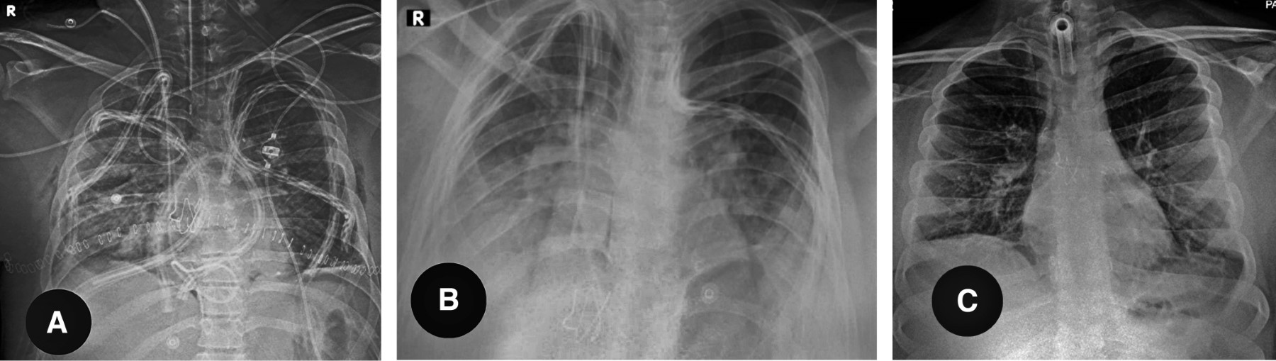 Se extubó a las 48 horas postquirúrgicas. Luego, a las 48 horas, presentó disnea progresiva (Figura 3), disociación toracoabdominal y aumento del requerimiento de oxígeno por cánula de alto flujo, así como opacidad pulmonar bilateral, se reintubó y ventiló al paciente con parámetros de protección. En el abordaje se evidenció las venas pulmonares permeables, las presiones venosas centrales por debajo de 8 cmH2O y sin evidencia de infección. Se estableció diagnóstico y manejo para disfunción primaria del injerto (DPI) grado 2, con soporte ventilatorio y umbral bajo para ExtraCorporeal Membrane Oxygenation (ECMO) de ser necesario. Durante las primeras 48 horas presentó mejoría, por lo que se realizó traqueostomía percutánea y se retiró sedación. El día 23 postrasplante presentó desaturación progresiva con retroceso en la capacidad funcional, en la radiografía aparecieron infiltrados alveolares bilaterales. En el abordaje no se documentó problemas de estenosis de venas pulmonares, sobrecarga hídrica o infecciones, por lo que se realizó broncoscopia con biopsias transbronquiales, las cuales evidenciaron rechazo agudo B1 (Figura 2). El mismo se manejó con bolos de metilprednisolona, presentando mejoría clínica (Figura 3).
