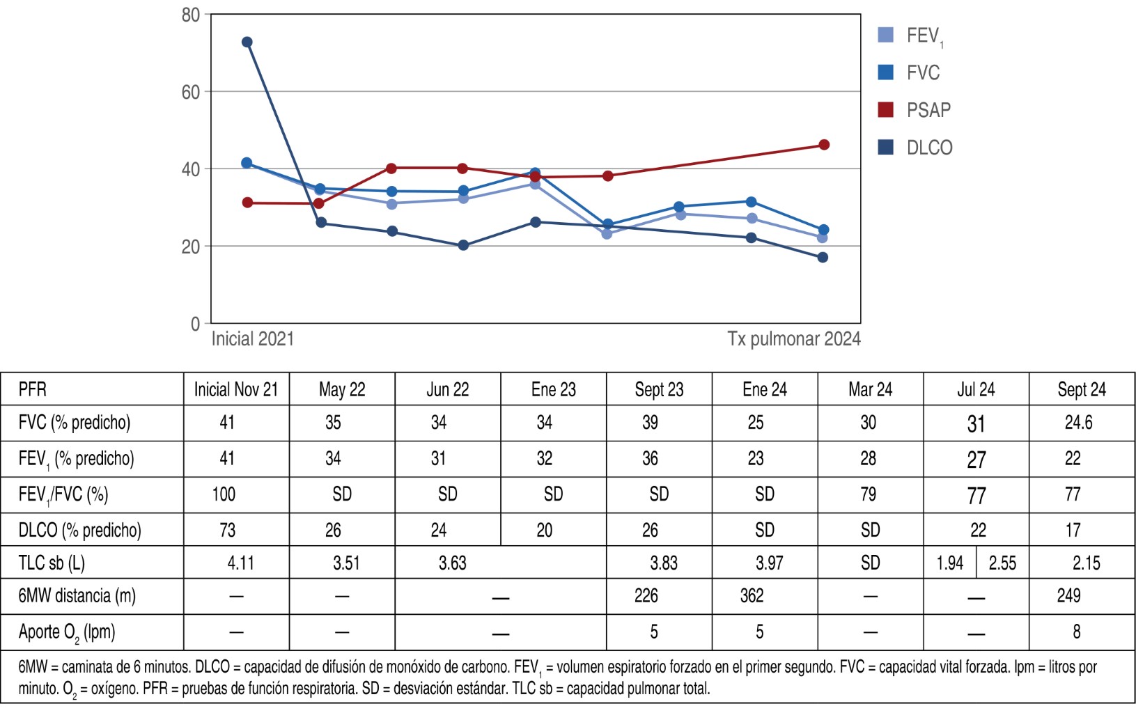 Un factor importante en el éxito de este caso fue ofrecer el trasplante de pulmón justo en el momento adecuado. En la gráfica anexa se observa claramente que se tomó la decisión de trasplantar en el momento del declive de la función cardiopulmonar (Figura 4). En nuestro medio, el trasplante pulmonar es incipiente. El reporte del año 2023, del Centro Nacional de Trasplantes (CENATRA), no incluye históricos de trasplante pulmonar por ser casos aislados.7 No obstante, la tendencia mundial es a ofertar el trasplante pulmonar cuando el paciente no se ha deteriorado hasta convertirse en paciente en estado crítico.8