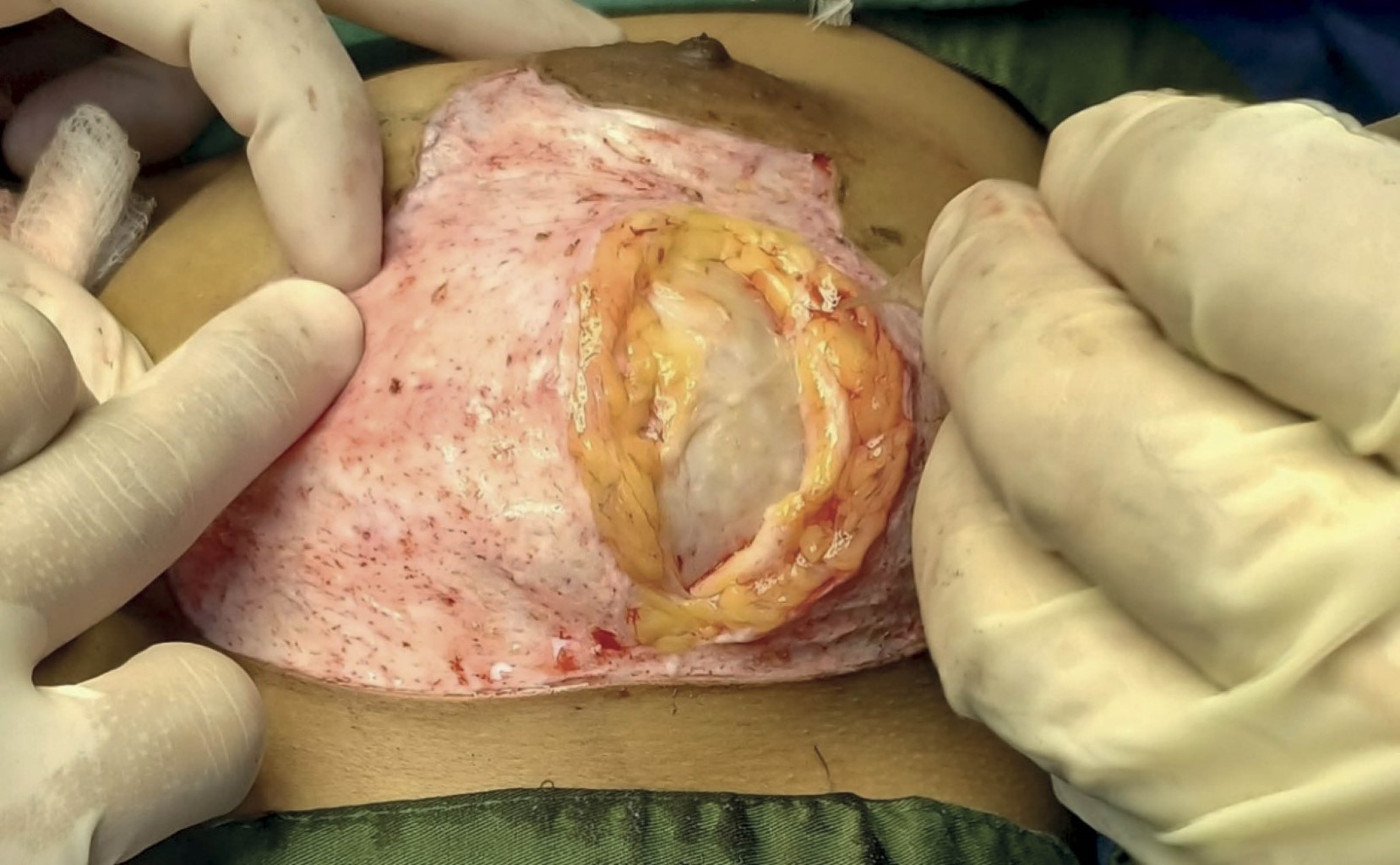 Bajo anestesia local infiltrativa de toda la piel y tejido celular subcutáneo, así como infiltración por debajo de la lesión tumoral de más del 70% de la base mamaria, se procedió a realizar incisiones de piel en el área marcada, se desepitelizó el área y se procedió a abrir verticalmente la dermis y el tejido celular subcutáneo hasta localizar la lesión tumoral (Figuras 2, 3 y 4). Se continuó con disección roma y tijeras a resecar completamente el tumor. Se remodeló la mama con colgajos dermograsos del área desepitelizada, fijando los colgajos al polo superior por debajo del complejo areola-pezón y hacia la línea media, evitando dejar espacios muertos, finalmente se cerró por planos hasta la piel. Se realizó exéresis del tumor en la unión de los cuadrantes superiores. Terminada la cirugía, se colocó vendaje compresivo. Se marcaron los bordes de ambas lesiones para su envío al departamento de anatomía patológica.
