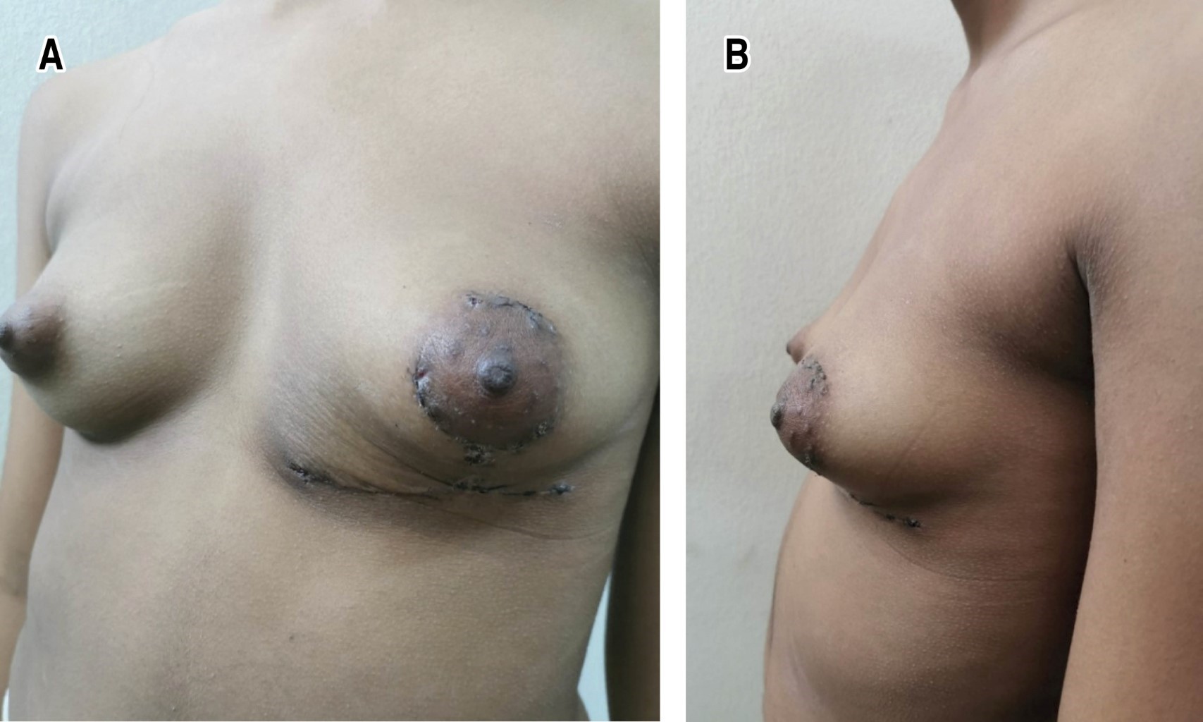Mujer de 21 años, de raza negra, con antecedentes patológicos personales de salud y de llevar seguimiento por la consulta de mastología hace dos años por presentar tumor en la mama izquierda. Se remitió a consulta de cirugía plástica para su valoración y posibilidad de tratamiento.