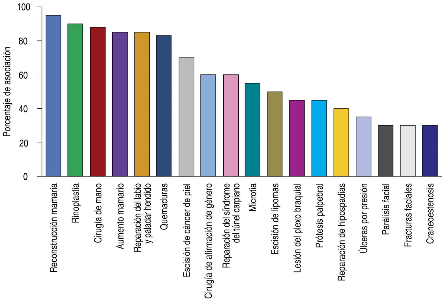 Los procedimientos asociados con más frecuencia con la cirugía plástica fueron la reconstrucción mamaria y el aumento mamario (95.1%), seguidos por la reparación de labio y paladar hendido (92.2%) y la rinoplastia (91.2%). En contraste, los procedimientos menos relacionados con la especialidad fueron la reparación del plexo braquial (24.5%), la liberación del túnel del carpo (30.9%) y la cirugía de craneosinostosis (35.5%) (Figura 1).