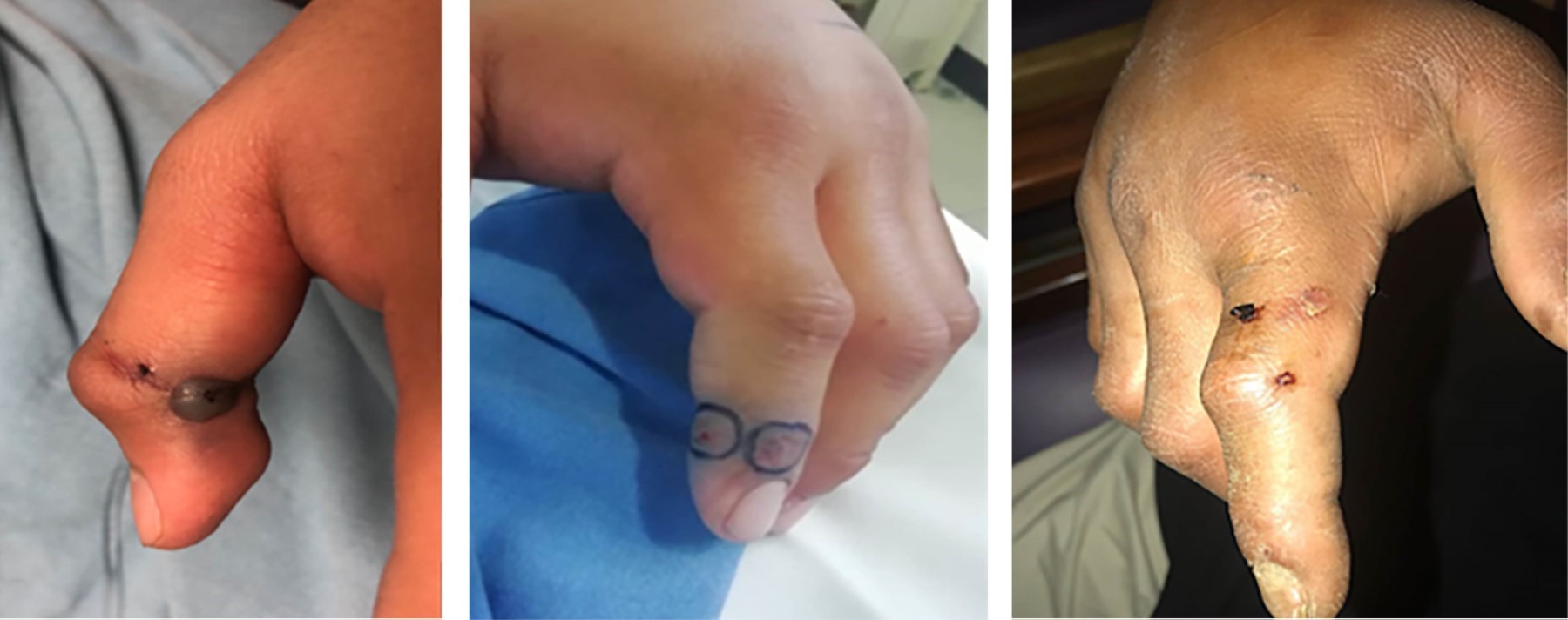 La presencia de una o dos heridas punzantes dejadas por un colmillo o un par de colmillos pueden indicar la mordedura de una serpiente venenosa de la familia viperidae, que tiene una dentadura solenoglifa (dos colmillos anteriores de gran tamaño, móviles, con un canal interior conectado a glándulas venenosas, que se pliegan cuando cierra la boca y se ponen rígidos cuando la abre) (Figura 1).5,10,16