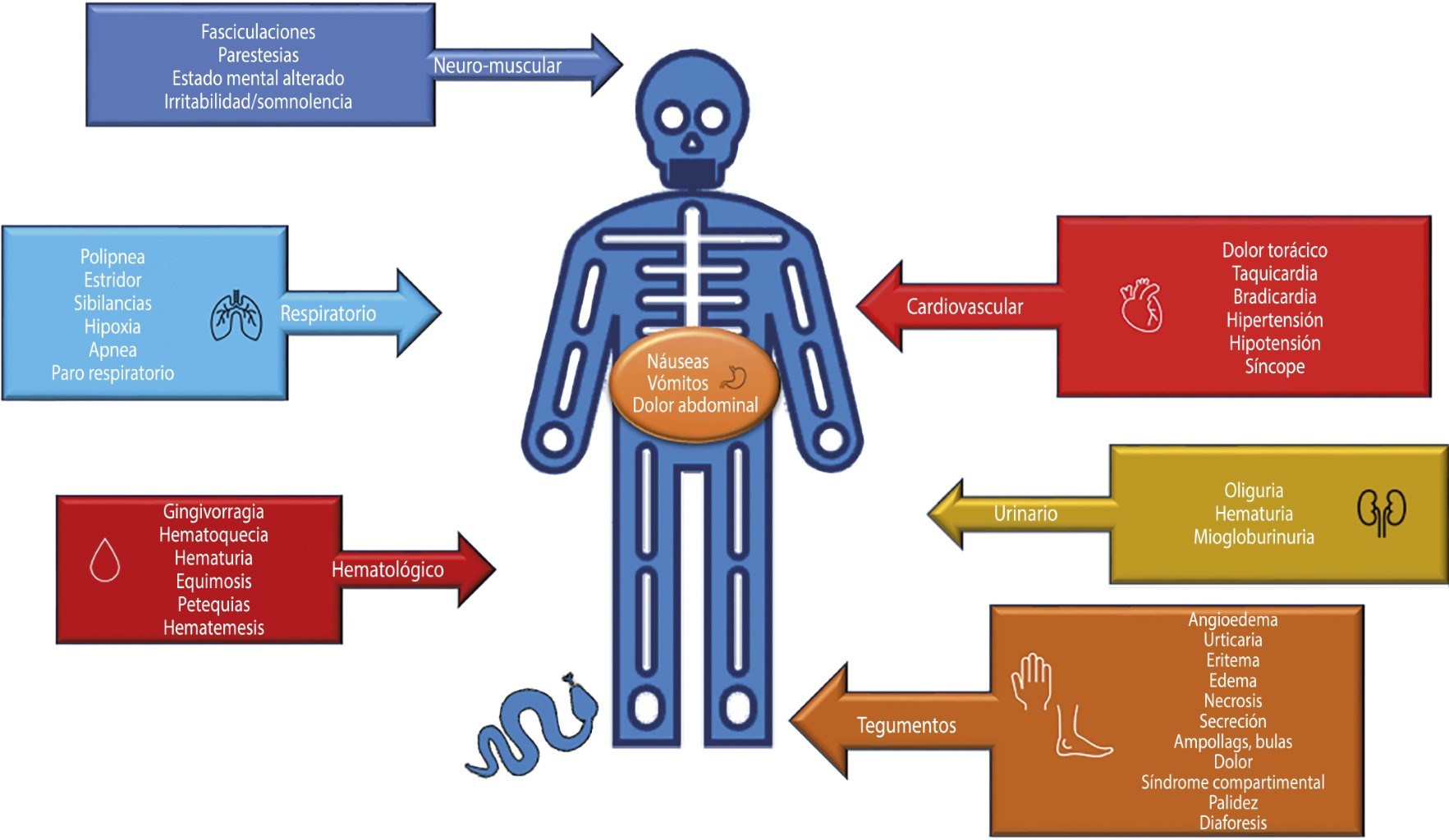 La mordedura de serpiente afecta entre 1.8 y 2.7 millones de personas en todo el mundo cada año, y se estima que causan entre 80,000 y 138,000 muertes.1,2 Los datos clínicos de envenenamiento pueden incluir alteraciones cutáneas, musculares, hematológicas, renales, pulmonares, cardíacas, neurológicas, entre otras, que en muchas ocasiones si no se instaura un tratamiento adecuado pueden ser mortales o generar secuelas a largo plazo.3
