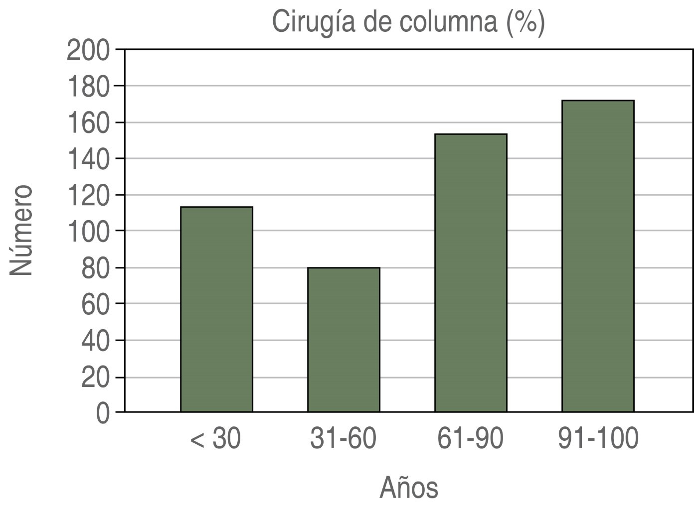 El 87% de los encuestados son del sexo masculino; el 57% son menores de 50 años (Figura 2), el 79% (410/519) de formación ortopedistas, el 72% presenta una antigüedad menor de 30 años (Figura 3), el 49% realiza su práctica en el sector público y el 63% se dedica en más de un 60% a la columna (Figura 4).