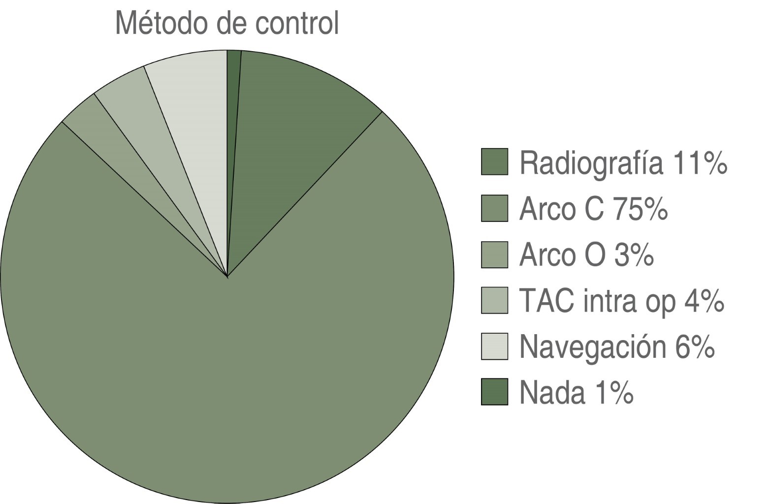 El método de control intraoperatorio más utilizado es la radioscopia por arco en C (75%), seguido por un 11% de radiografía (Figura 5); la razón por la cual se usa más frecuentemente es la marcación de nivel (21%), el control final de la osteosíntesis (20%) y las prácticas terapéuticas (18%) (Figura 6).