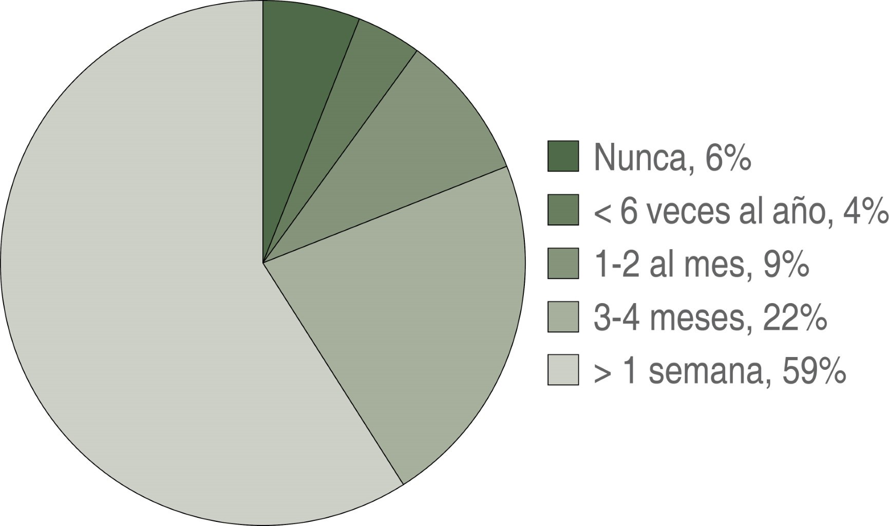 El 59% de los encuestados utiliza rayos intraoperatorios más de una vez por semana, seguido por 22% de tres a cuatro veces por mes y un 9% de una a dos veces por mes (Figura 7). Con una utilización en forma pulsátil en el 83% de los casos, controlando el tiempo real de exposición en el 33% de los encuestados, sólo el 27% de ellos realiza un control del tiempo de utilización.