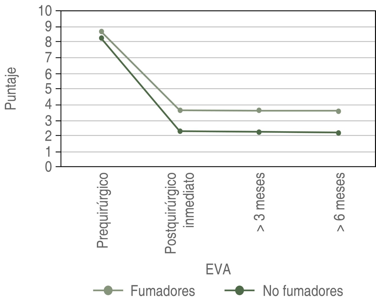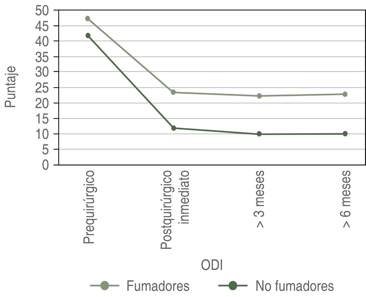 Análisis de subgrupos fumadores versus no fumadores. El análisis de los datos obtenidos categorizó a los pacientes en grupos de fumadores y no fumadores para evaluar su impacto en el dolor, la discapacidad y la calidad de vida.