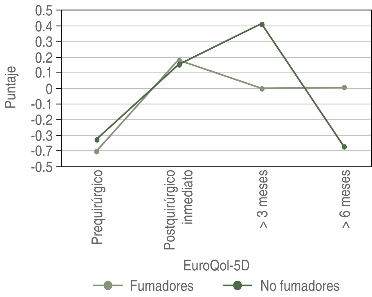 El análisis del cuestionario de calidad de vida EuroQol-5 también mostró que los pacientes no fumadores obtuvieron puntaje mayor que los sujetos con tabaquismo positivo, con una notable mejoría con valor de p < 0.05, en el periodo mayor a seis meses posterior a la intervención e inicio de tratamiento de rehabilitación física (Figura 4).
