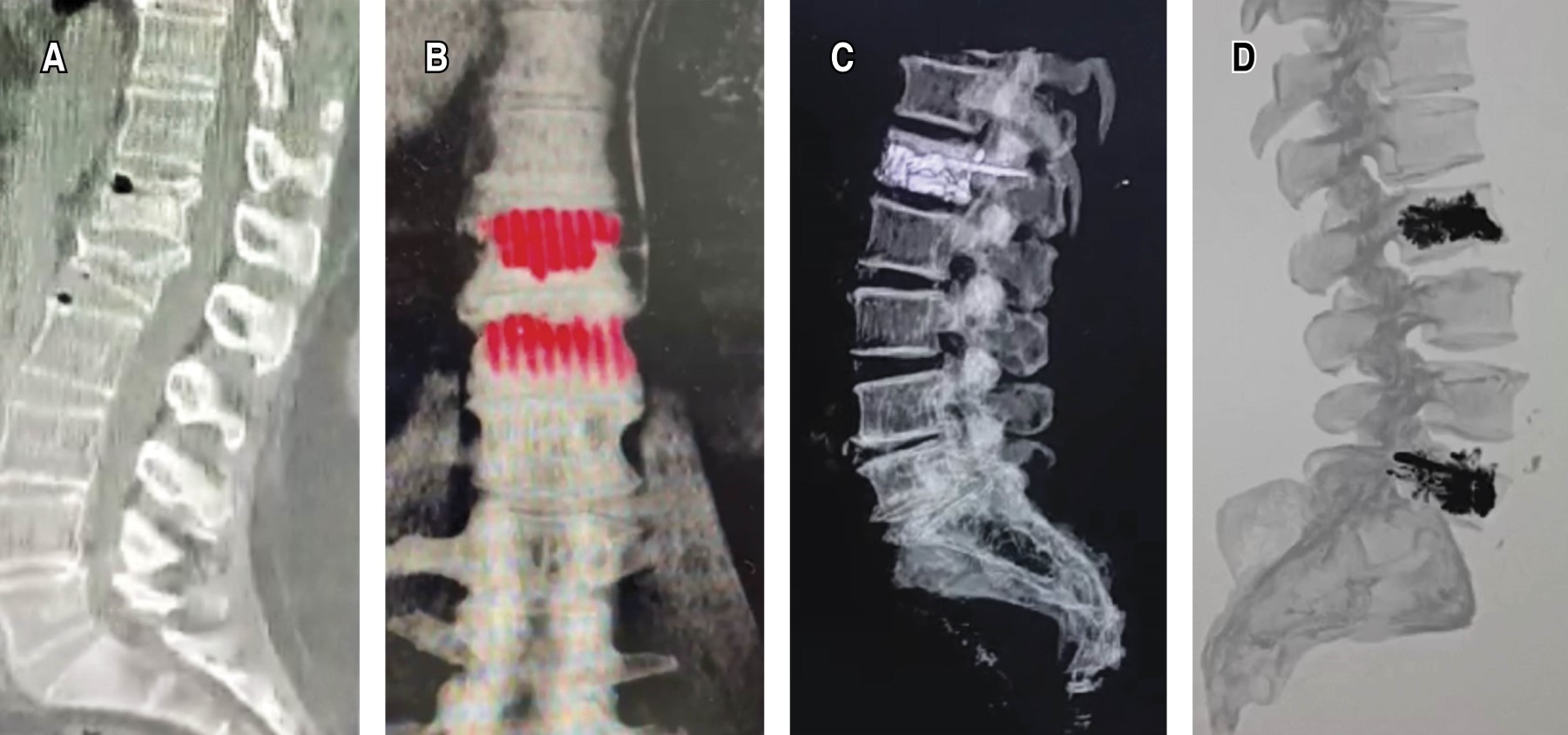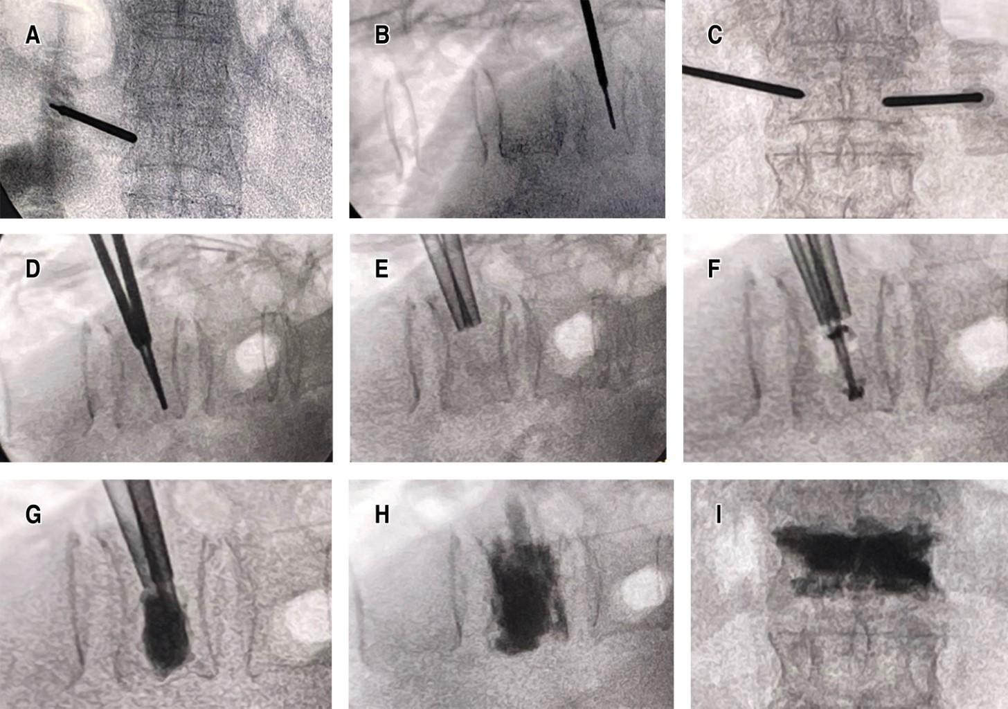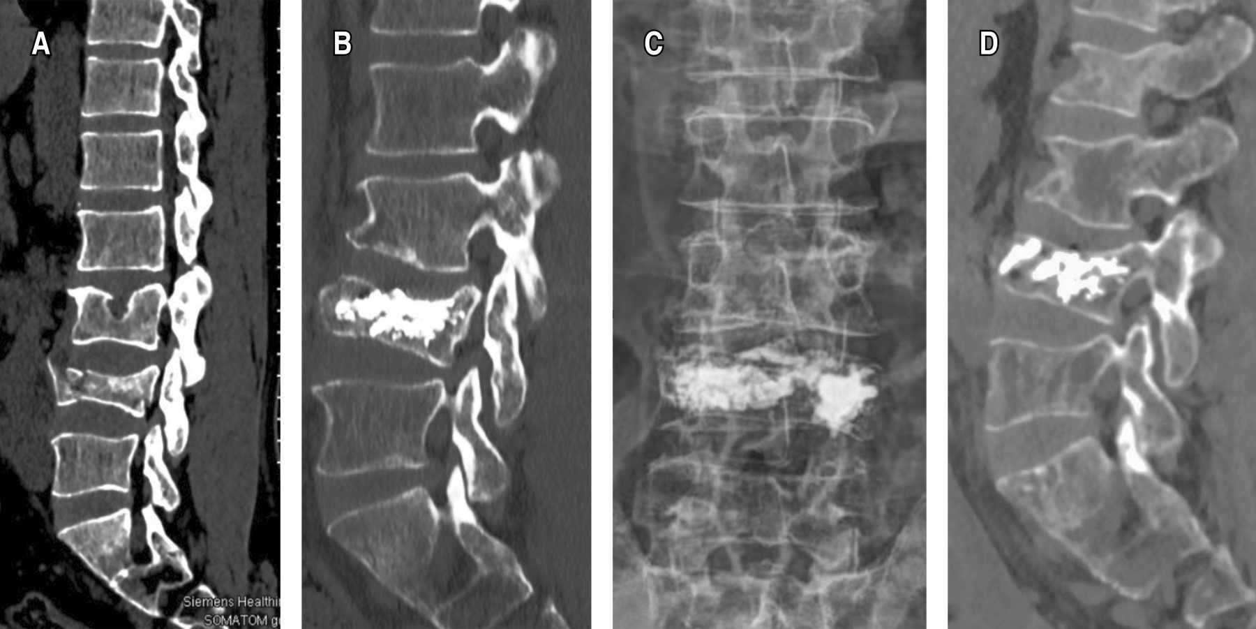 Tradicionalmente, el tratamiento de las fracturas vertebrales por compresión ha sido conservador, enfocado en el reposo, la administración de analgésicos, la terapia física y la utilización de ortesis para reducir el dolor y facilitar la movilidad temprana. Sin embargo, el manejo conservador frecuentemente no logra resultados satisfactorios en términos de alivio del dolor y recuperación funcional a largo plazo, especialmente en pacientes con fracturas severas o múltiples.16,17 Esto ha llevado al desarrollo y creciente adopción de técnicas quirúrgicas mínimamente invasivas que buscan estabilizar rápidamente la vértebra afectada, reducir el dolor de manera inmediata y facilitar una recuperación funcional precoz y sostenida. Entre estas técnicas quirúrgicas, la vertebroplastía y la cifoplastía han ganado amplia aceptación por su eficacia comprobada en estabilizar la estructura vertebral fracturada y proporcionar un alivio rápido del dolor (Figura 4). La cifoplastía, en particular, ha demostrado ventajas adicionales sobre la vertebroplastía, como la recuperación parcial de la altura vertebral y menor riesgo de complicaciones asociadas con la fuga de cemento hacia los tejidos adyacentes.18,19 Aunque la cifoplastía ofrece resultados positivos en la mayoría de los casos, persiste una proporción considerable de pacientes que experimentan dolor residual postoperatorio, frecuentemente vinculado con patologías de las articulaciones facetarias adyacentes, las cuales suelen verse afectadas directa o indirectamente por el proceso de fractura o por alteraciones biomecánicas secundarias a la fractura y su tratamiento. Este dolor facetario residual representa un desafío clínico significativo, dado que limita considerablemente la recuperación funcional óptima.20,21 La necesidad de abordar este tipo específico de dolor residual ha motivado la exploración de estrategias complementarias que puedan integrarse a la cifoplastía para optimizar el control del dolor inmediato y sostenido en el periodo postoperatorio. Dentro de estas estrategias complementarias, la RF-P aplicada a las facetas articulares ha emergido recientemente como una técnica innovadora y prometedora, debido a su capacidad para producir neuromodulación efectiva sin destruir irreversiblemente las estructuras nerviosas implicadas.22,23