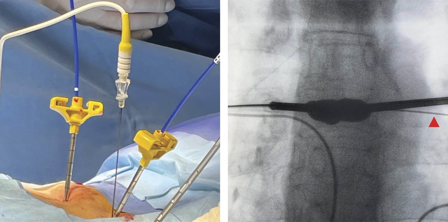 El procedimiento quirúrgico se estandarizó para todos los participantes. La cifoplastía se realizó con el paciente bajo anestesia general o sedación profunda según el criterio anestésico individualizado. La técnica implicó la inserción percutánea de cánulas a través de abordaje posterior bilateral hasta alcanzar la vértebra afectada, seguida de inflado de balones específicos para la restauración de la altura vertebral y estabilización del cuerpo vertebral con cemento radiopaco (polimetilmetacrilato, PMMA). Posteriormente, de manera inmediata tras concluir la cifoplastía, se aplicó la técnica de RF-P en las facetas articulares correspondientes al nivel tratado. Este procedimiento fue realizado utilizando un equipo especializado de RF-P, ajustado a parámetros estandarizados (temperatura máxima de 42 °C, pulsos con duración de 20 ms y una pausa de 480 ms durante cuatro minutos por cada faceta articular tratada) (Figuras 1 y 2).