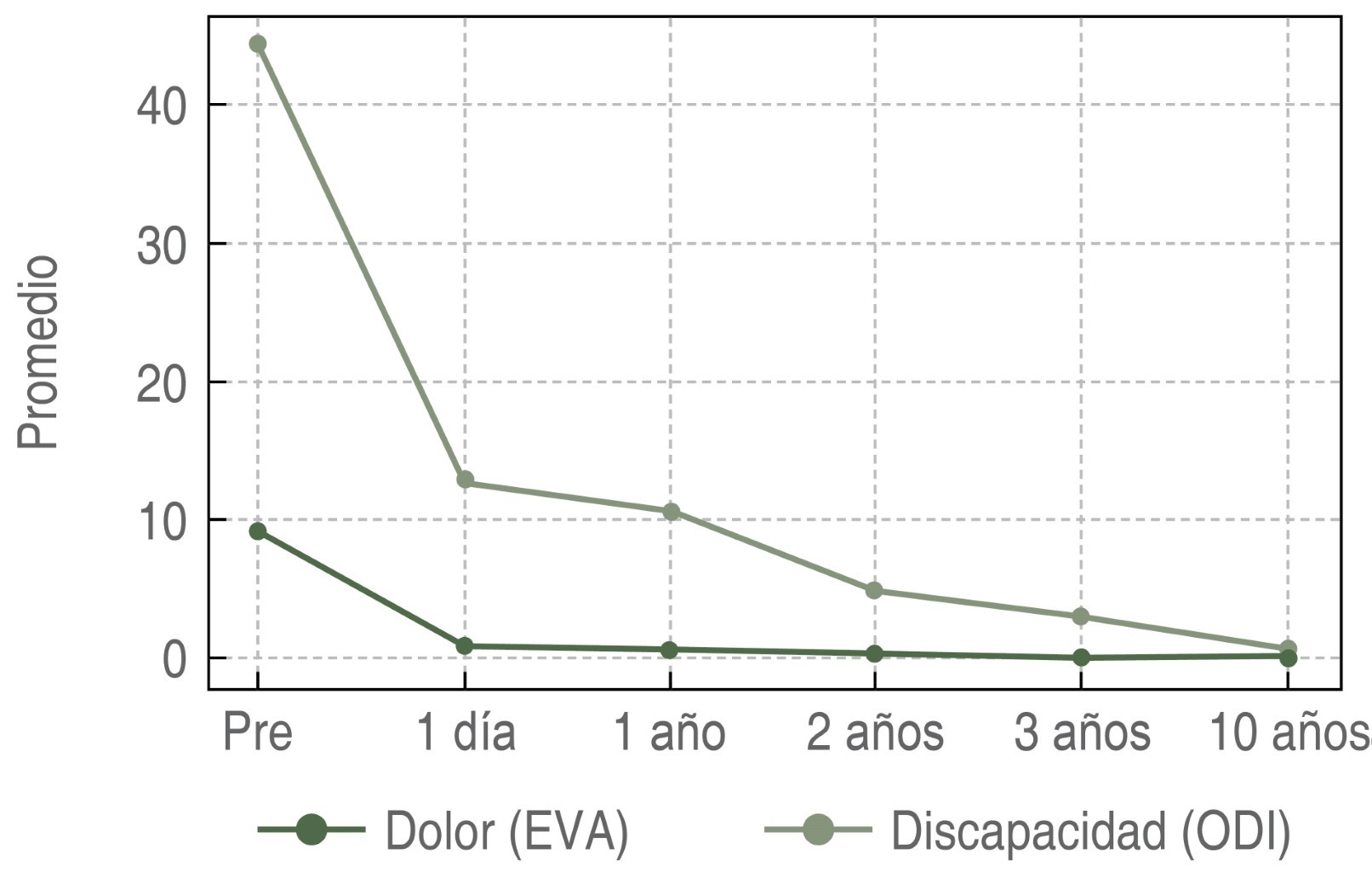 En cuanto a la presentación clínica inicial, el dolor lumbar incapacitante fue un hallazgo universal. El puntaje de dolor preoperatorio medido por la EVA fue en promedio 9.2 ± 0.7, con mediana de 9 (rango 8 a 10), lo que indica que prácticamente todos los pacientes tenían dolor intenso antes del procedimiento (Tabla 2). De igual forma, el grado de discapacidad funcional preoperatoria medido con el índice de discapacidad de Oswestry (ODI) fue muy elevado: promedio 44.4 ± 3.2 puntos, equivalente a 88.8% de discapacidad; por tanto, todos los pacientes se encontraban en rangos de discapacidad severa previo a la cirugía (ODI > 40 puntos).